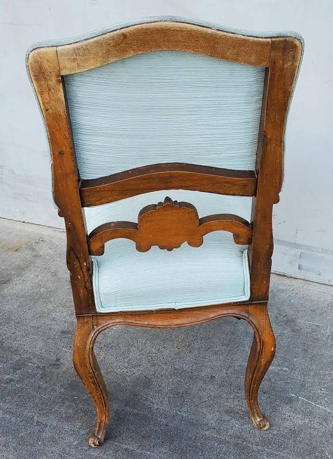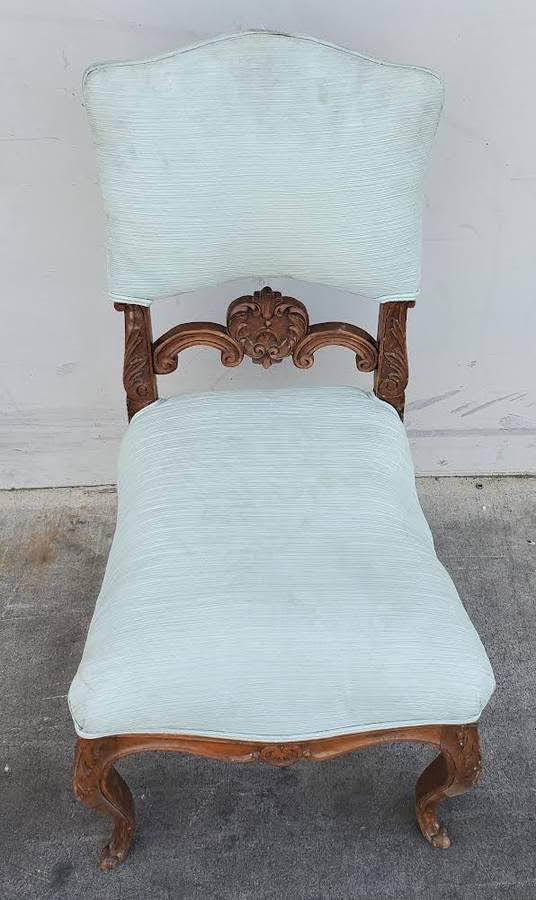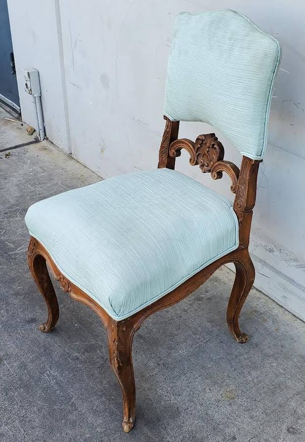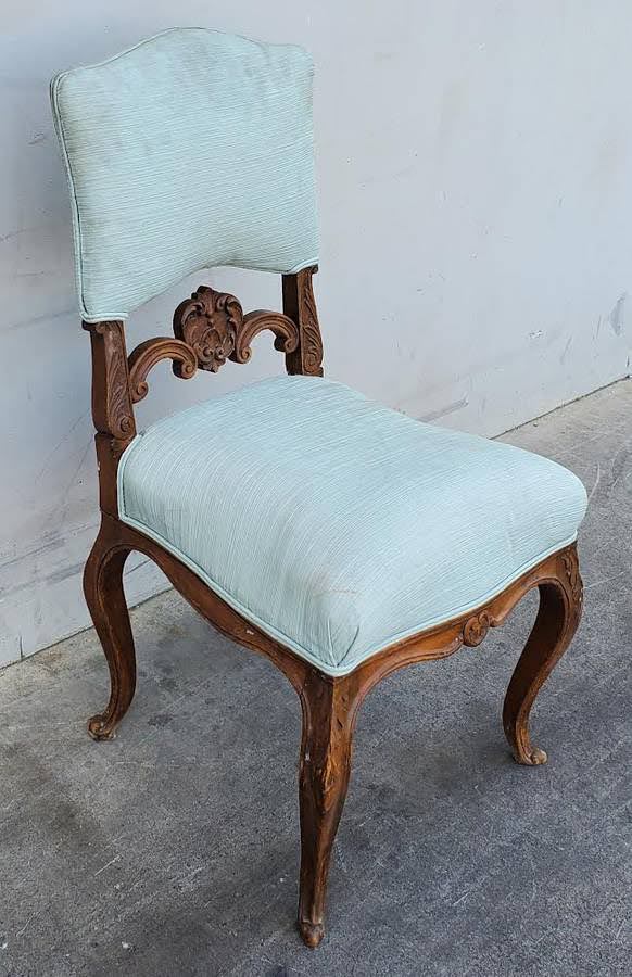 Hello we are selling an Antique/vintage carved wood light blue cushion side chair, it is in good condition.