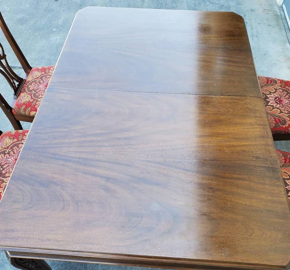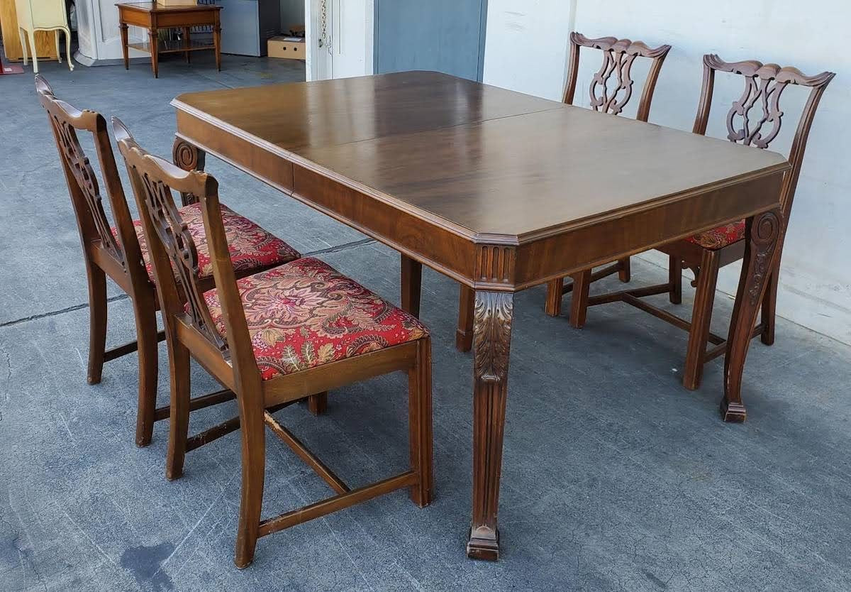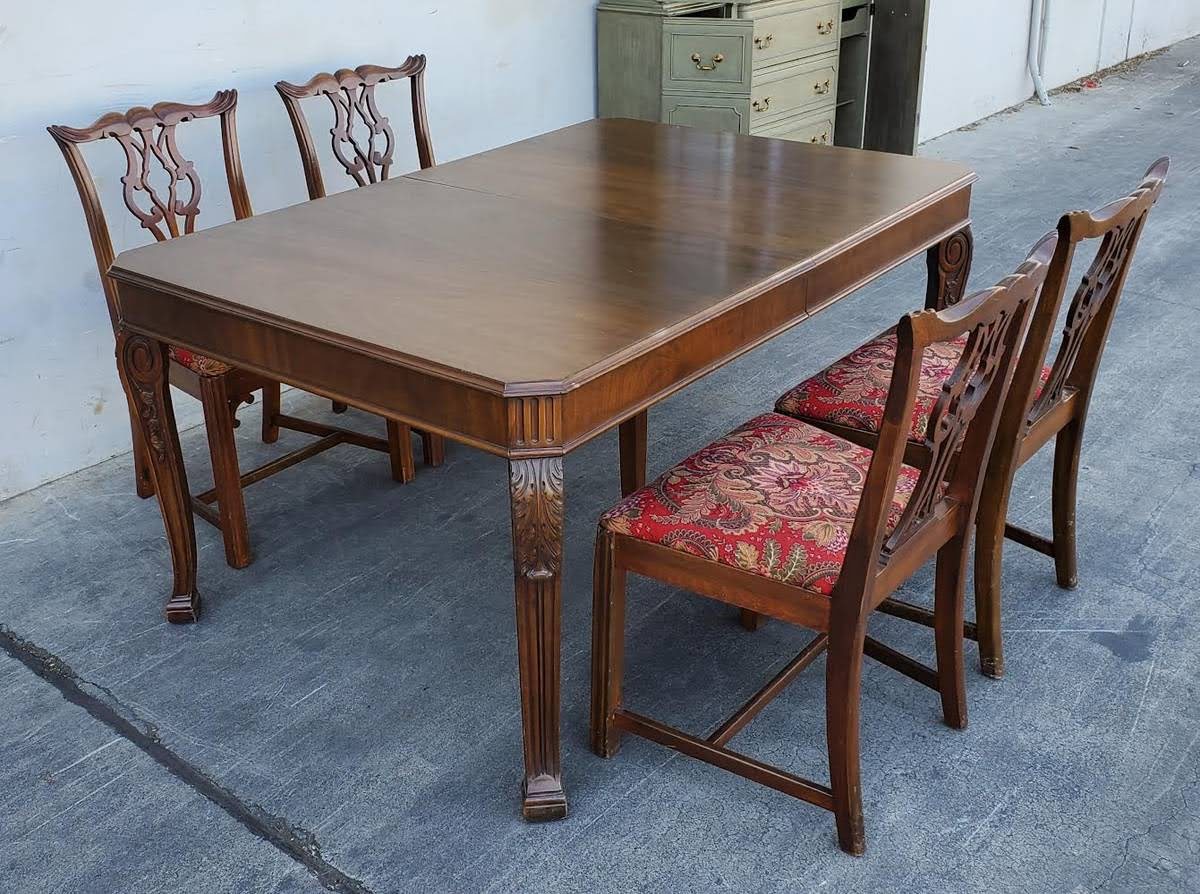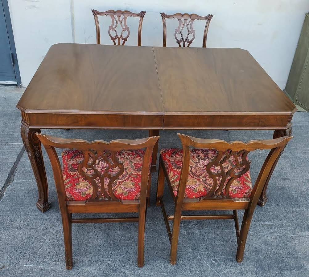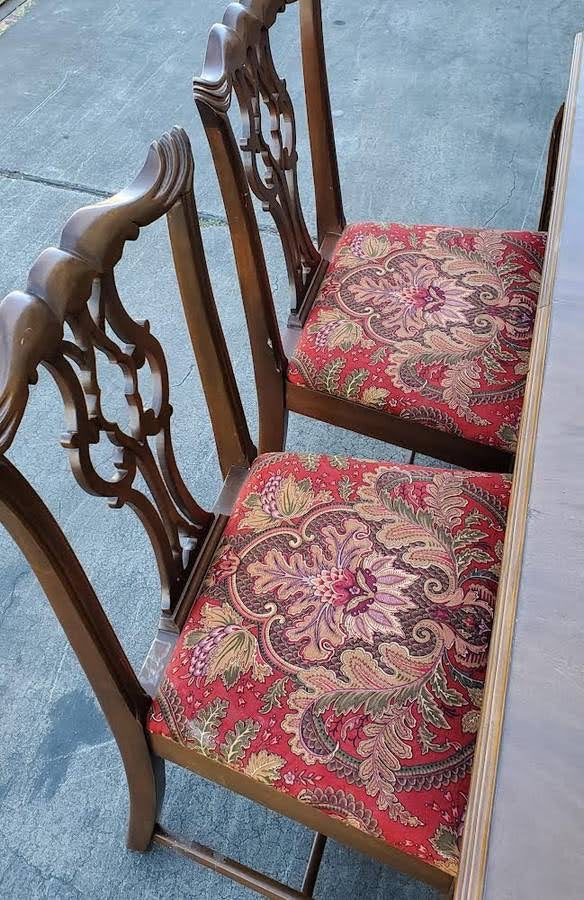 Hello we are selling an Antique/vintage dining table with 4 chippendale style chairs red floral cushions , it is in good condition.