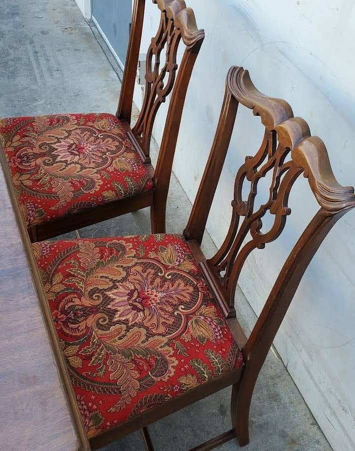 Antique/vintage dining table with 4 chippendale style chairs red floral cushions