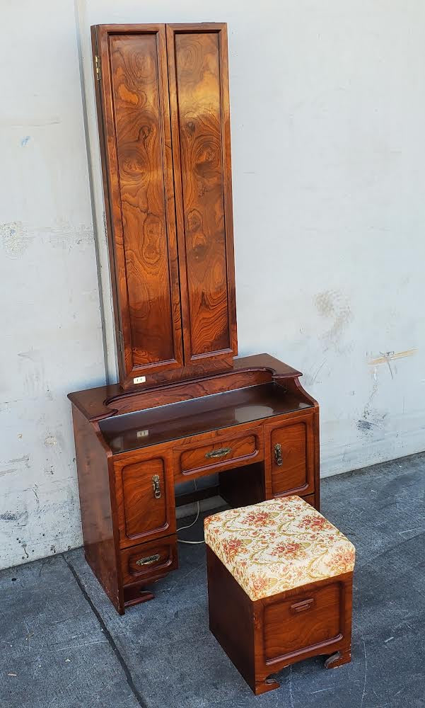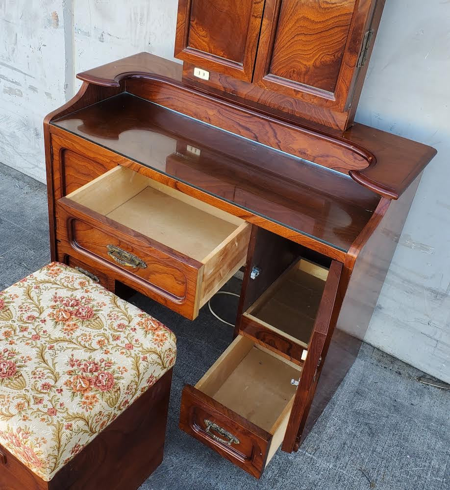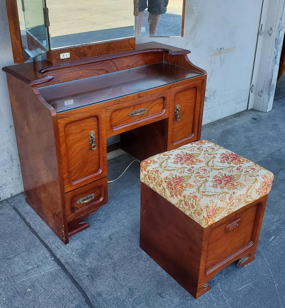 Hello we are selling an antique/vintage vanity dresser/table tri-fold mirror with stool , it is in good condition.