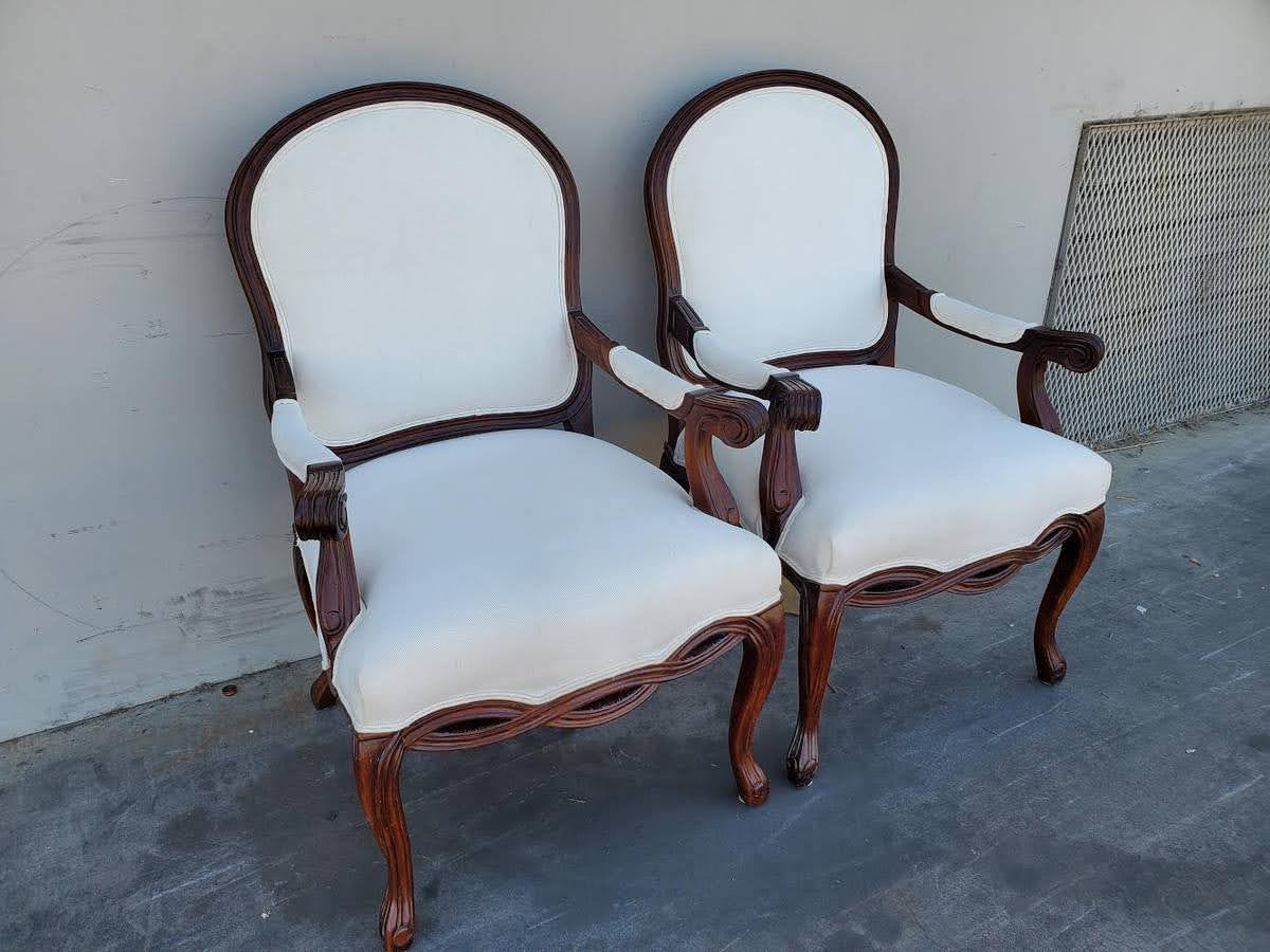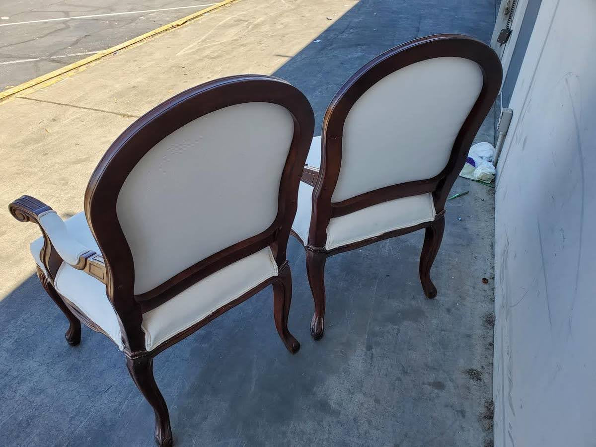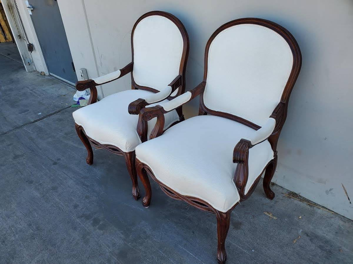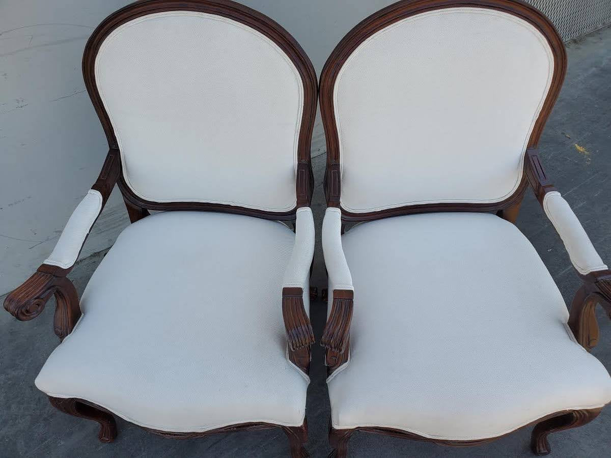 Hello we are selling an Armchairs (2) dark wood white cushioned seat French provincial/queen Anne legs style, it is in good condition.