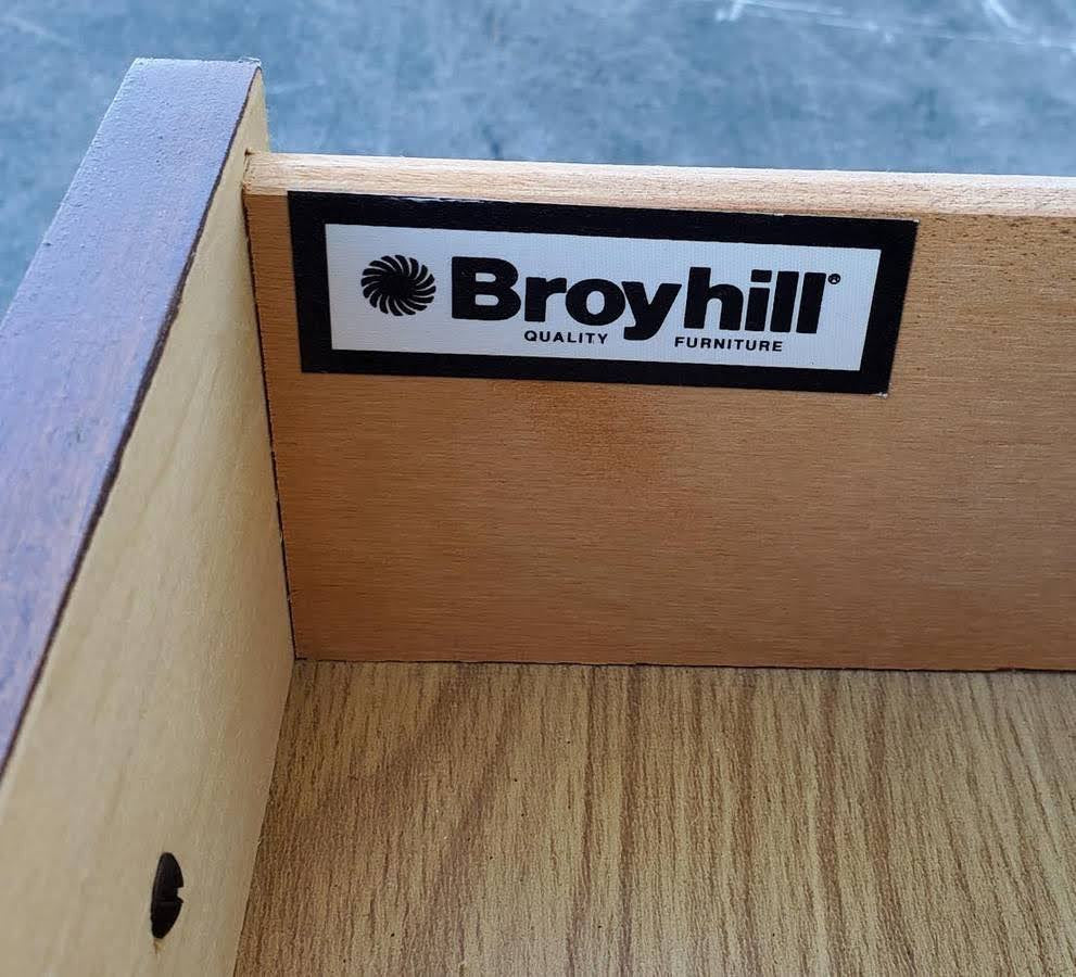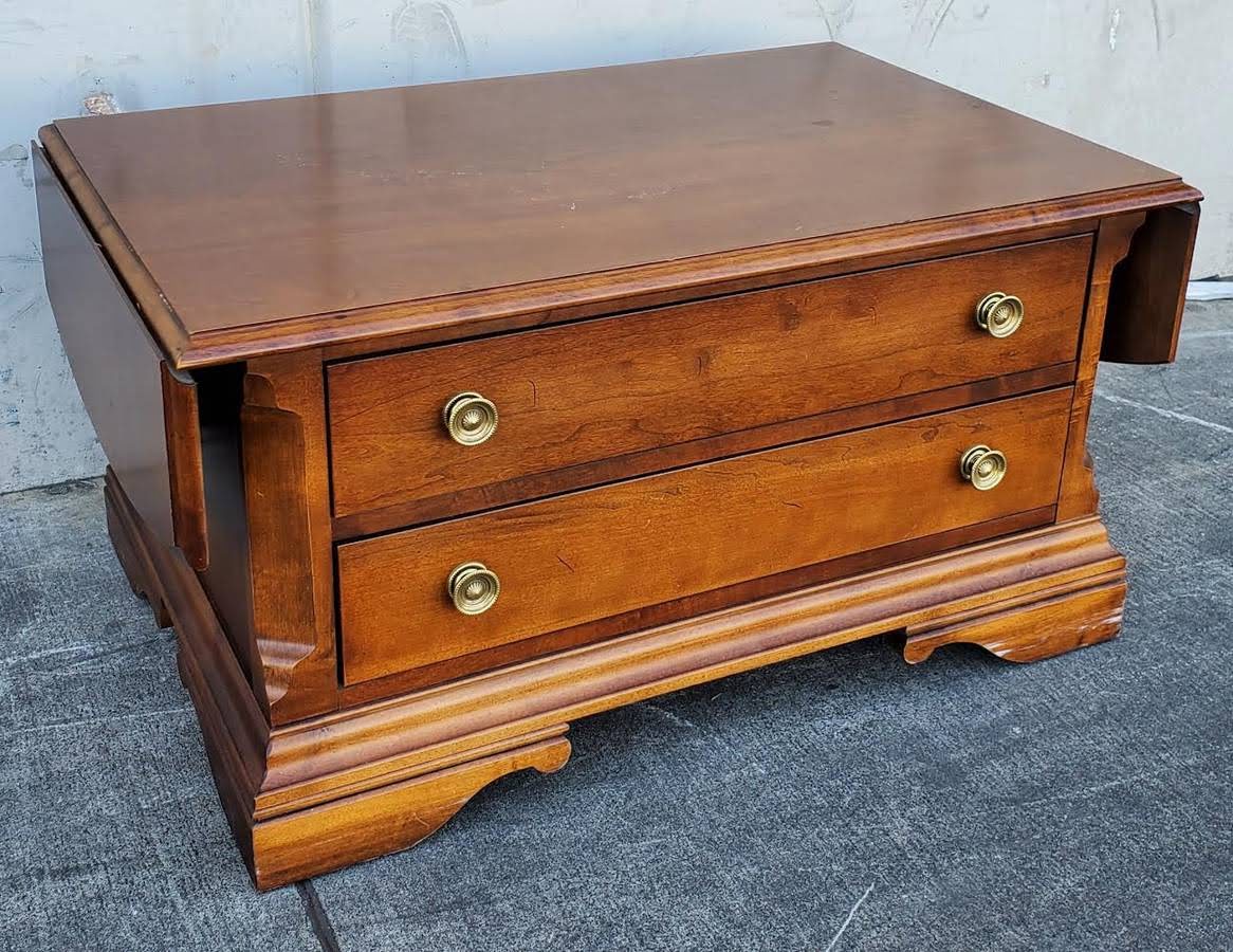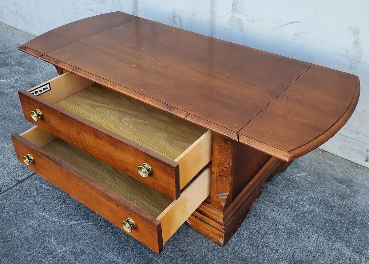 Hello we are selling a Broyhill coffee table with 2 drawers and side drop down extensions , it is in good condition.