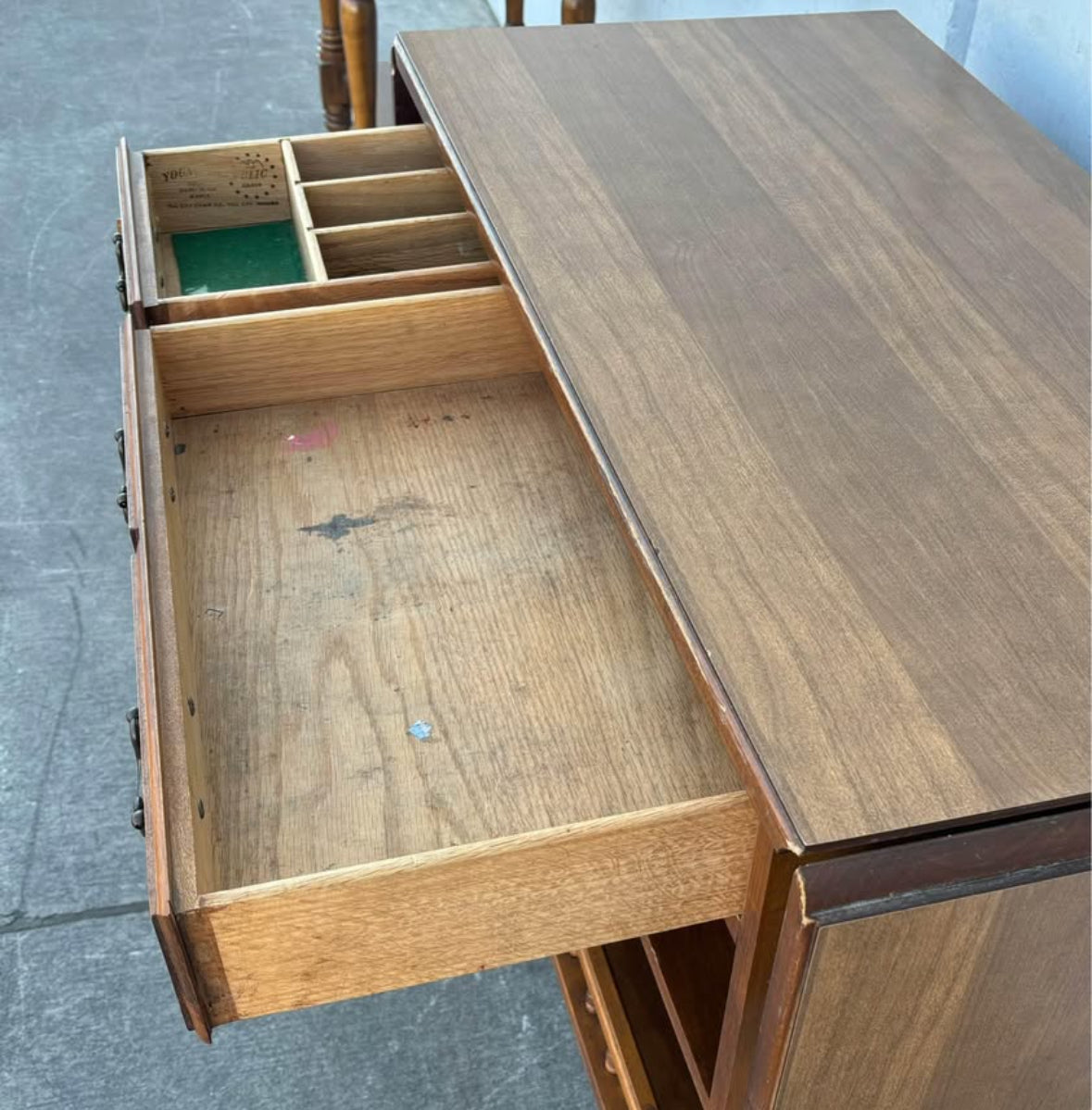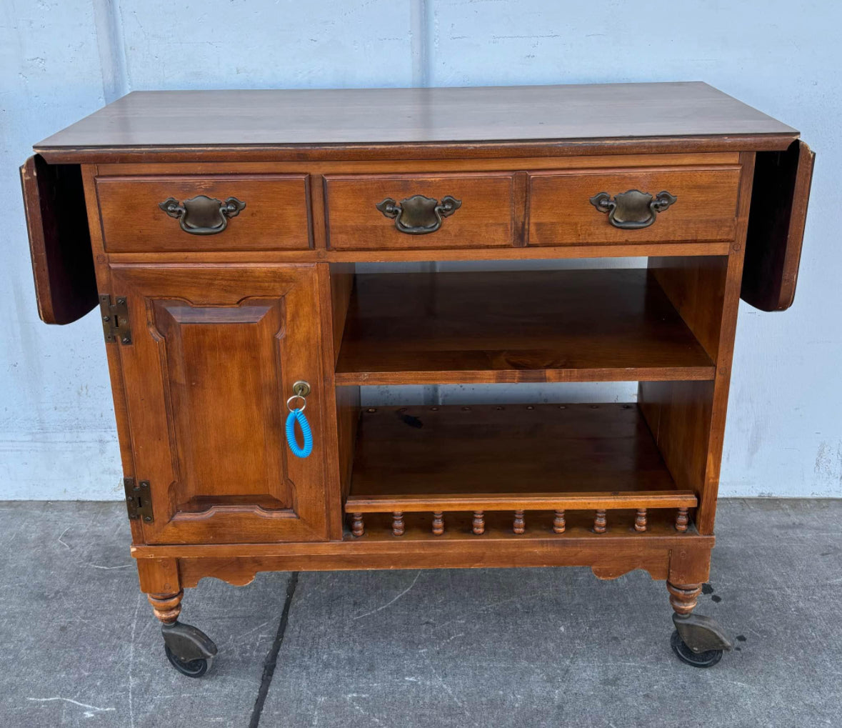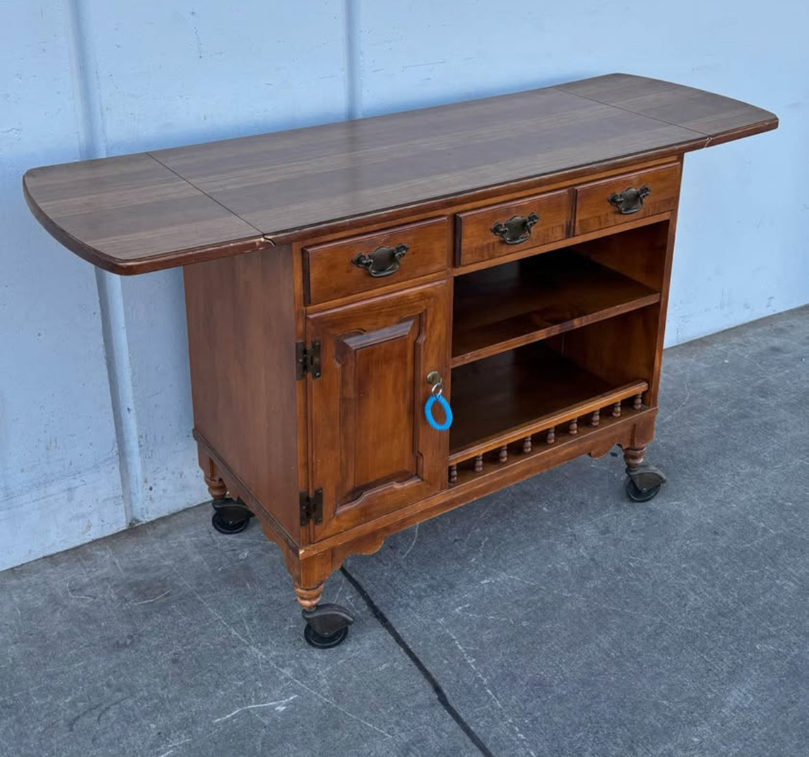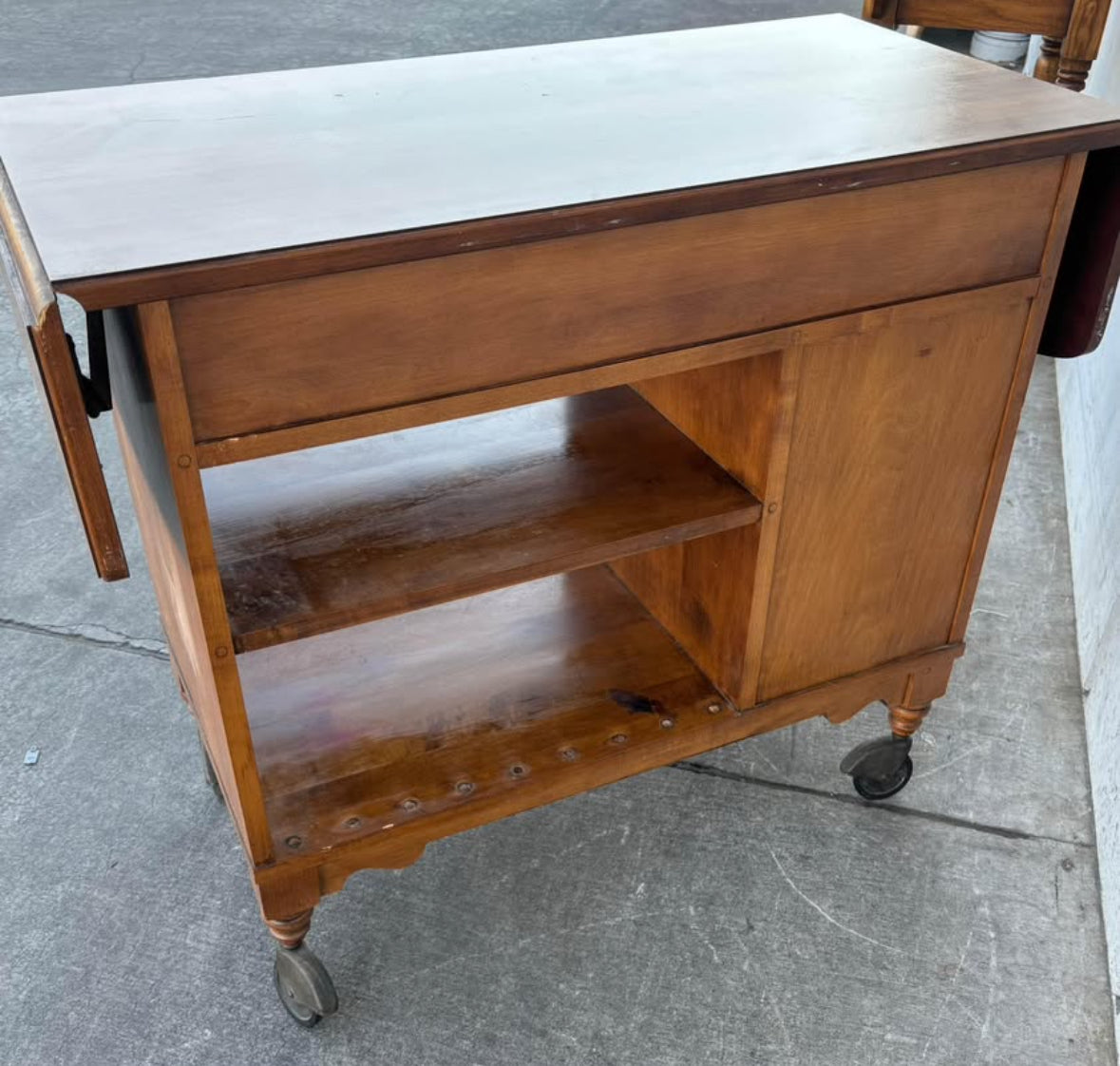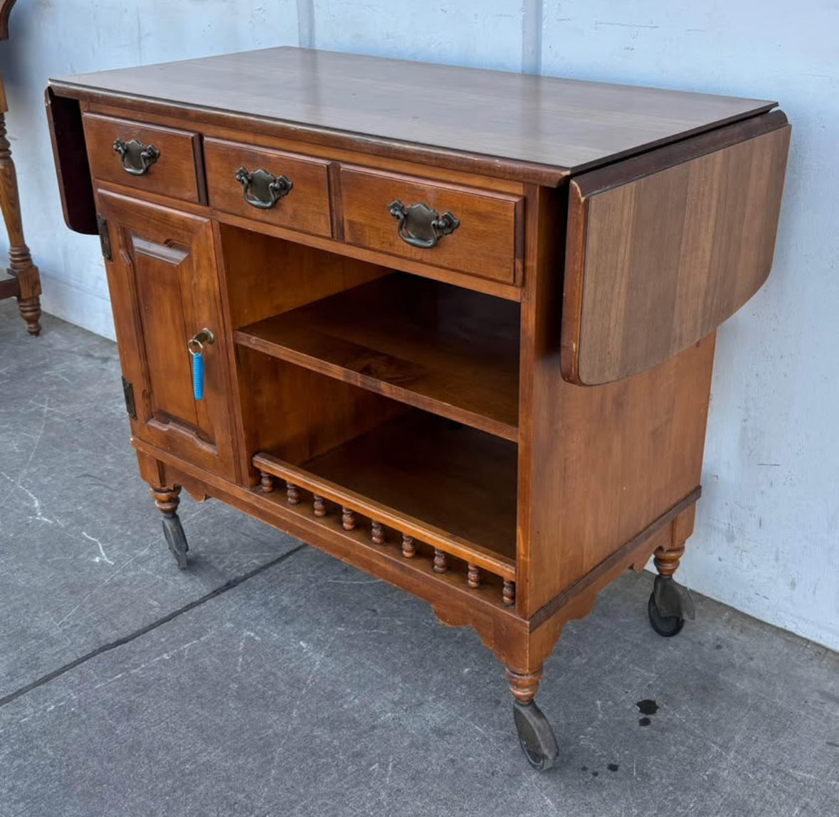 Hello we are selling a Dark Wood Kitchen Buffet Cabinet on Wheels , it is in good condition .