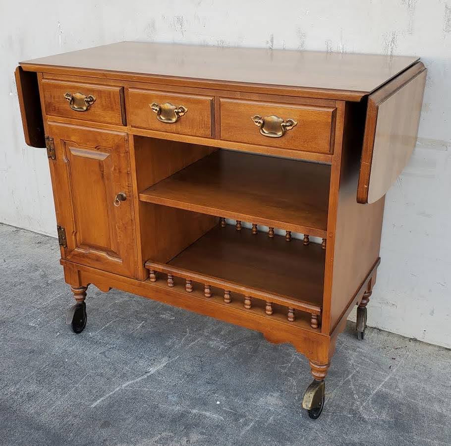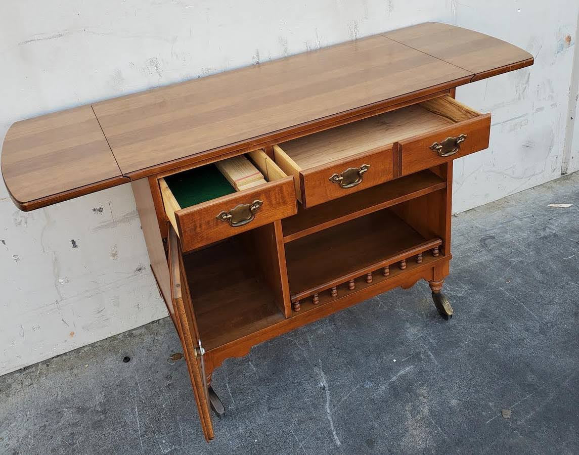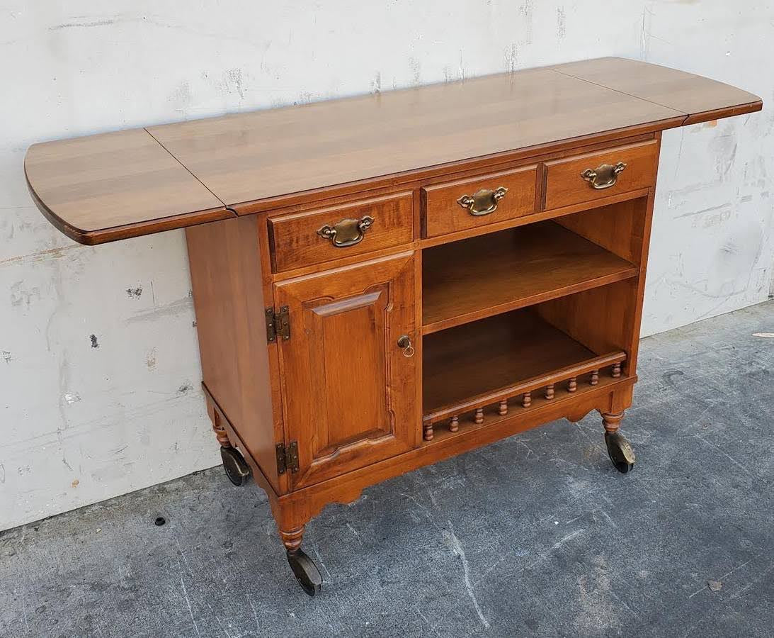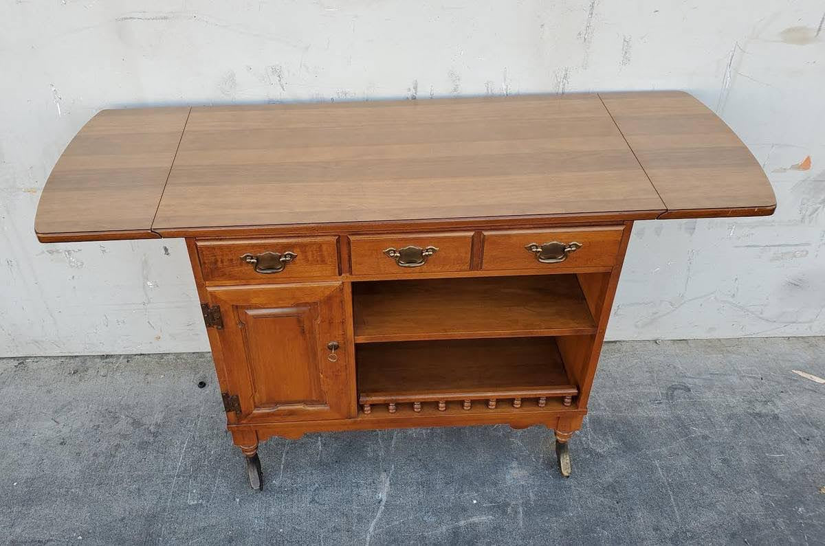 Hello we are selling a Dark wood kitchen buffet cabinet on wheels with drop side leaves, it is in good condition.