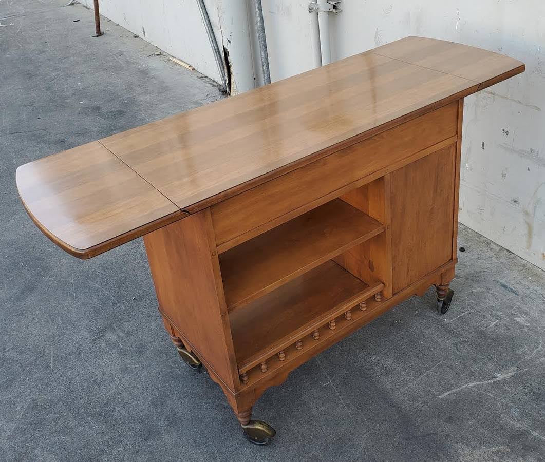 Dark wood kitchen buffet cabinet on wheels with drop side leaves