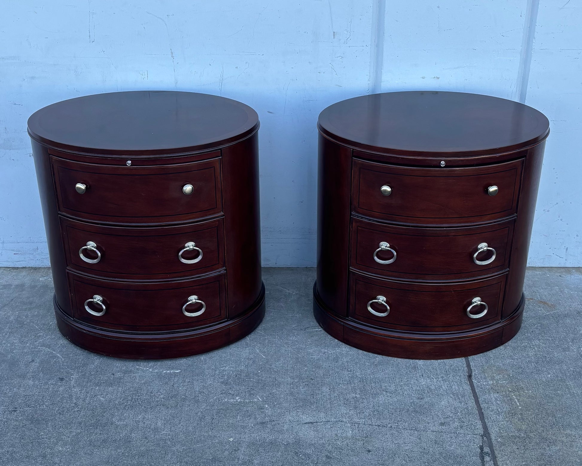 Hello we are selling a dark wood round nightstands / end/ side tables , it is in good condition .