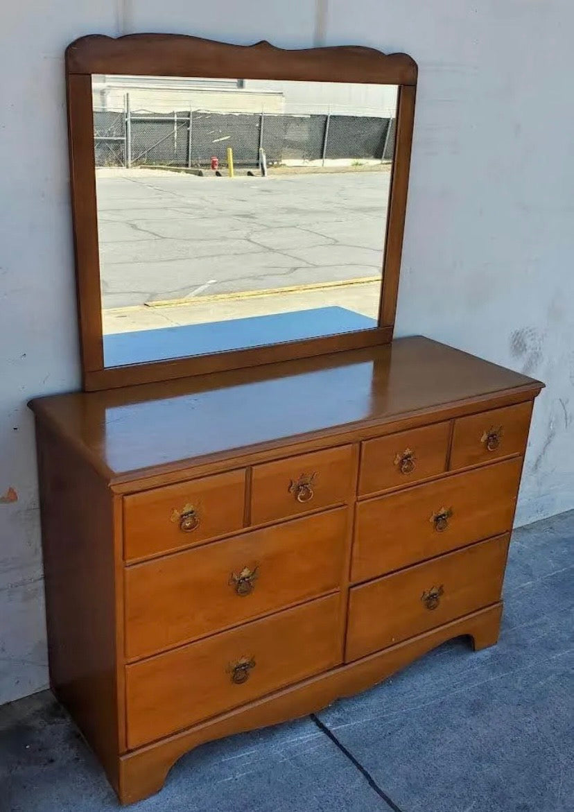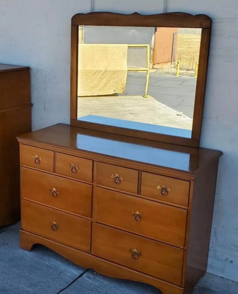 Hello we are selling a Dresser with mirror dark wood ,it is in good condition.