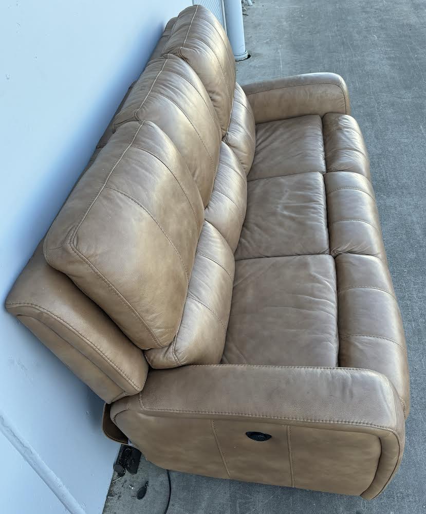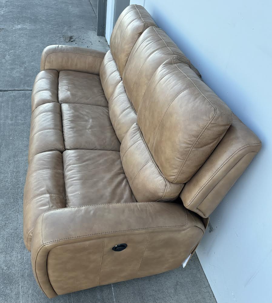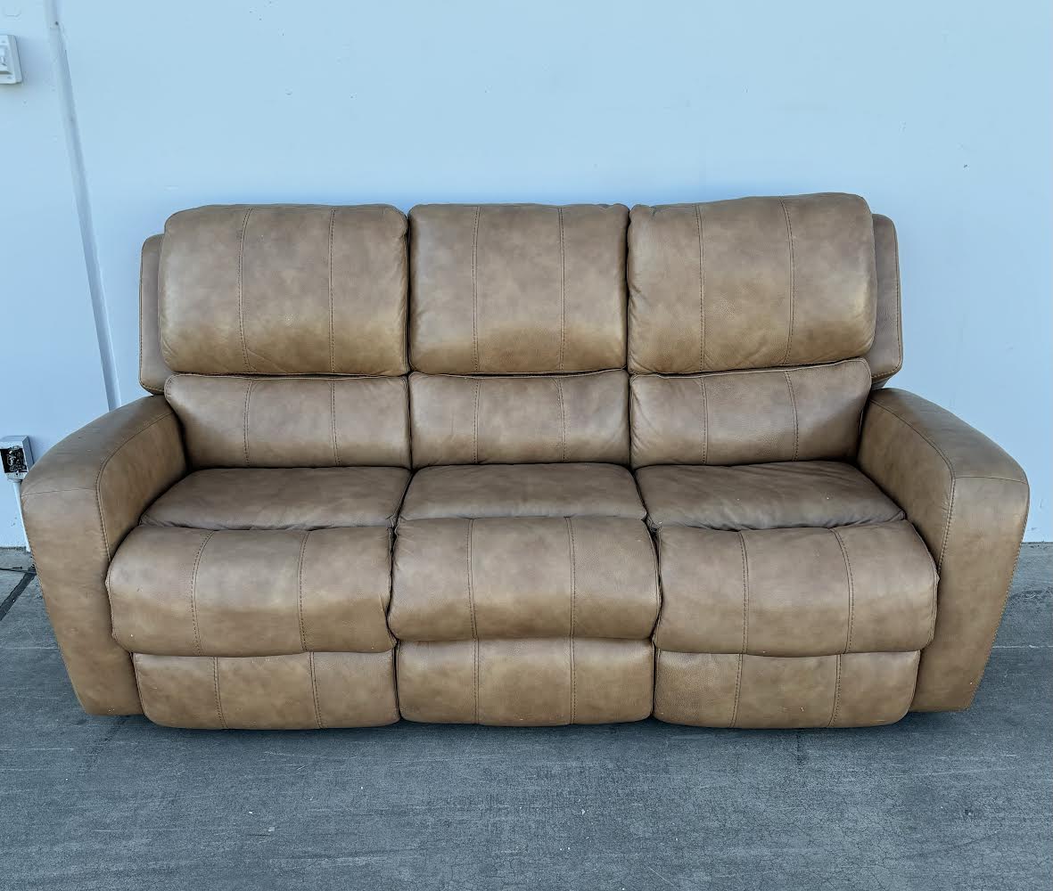 Hello we are selling a Light Brown Leather Reclining Sofa , it is in good condition.