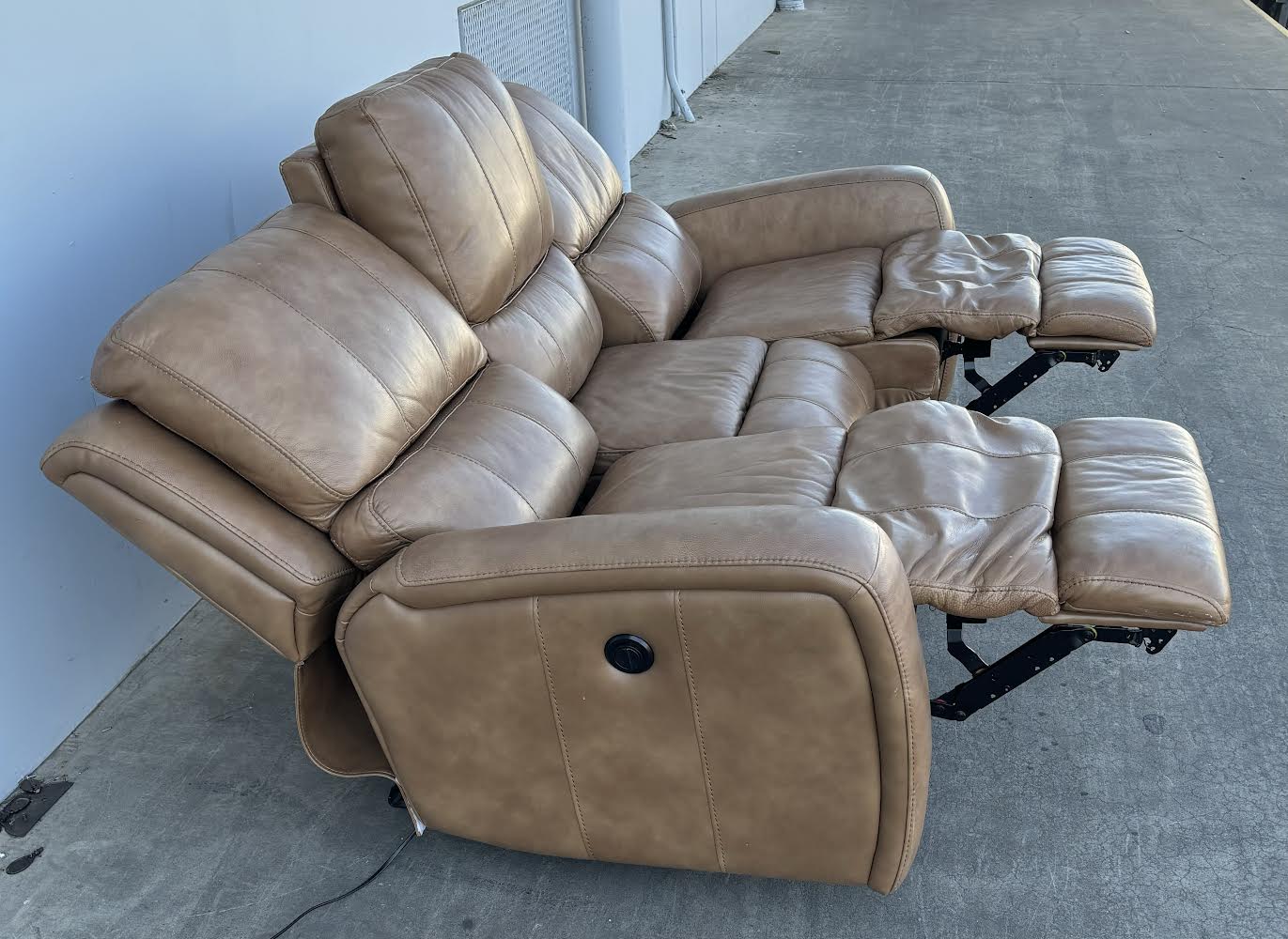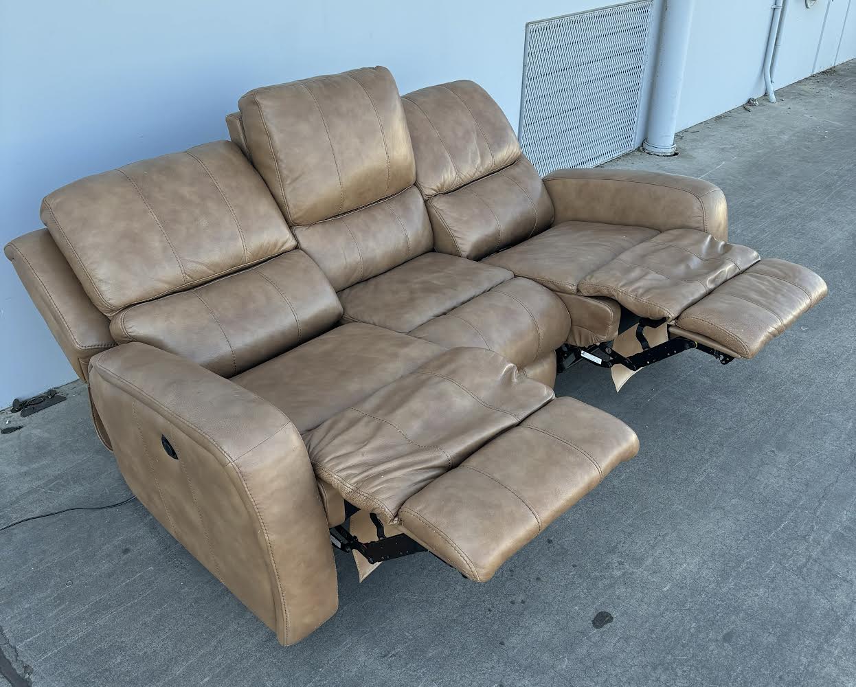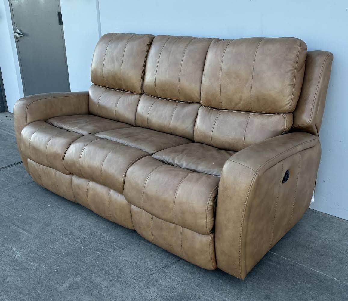 Hello we are selling a Light Brown Leather Reclining Sofa , it is in good condition.