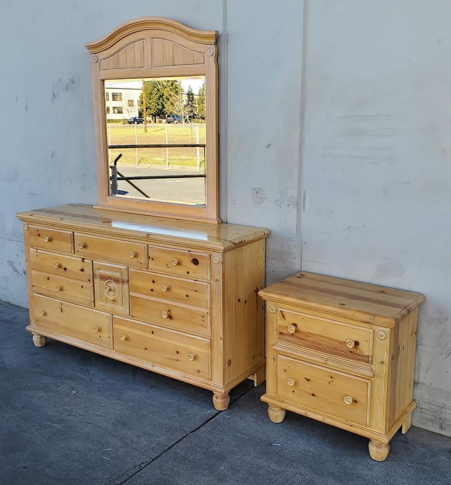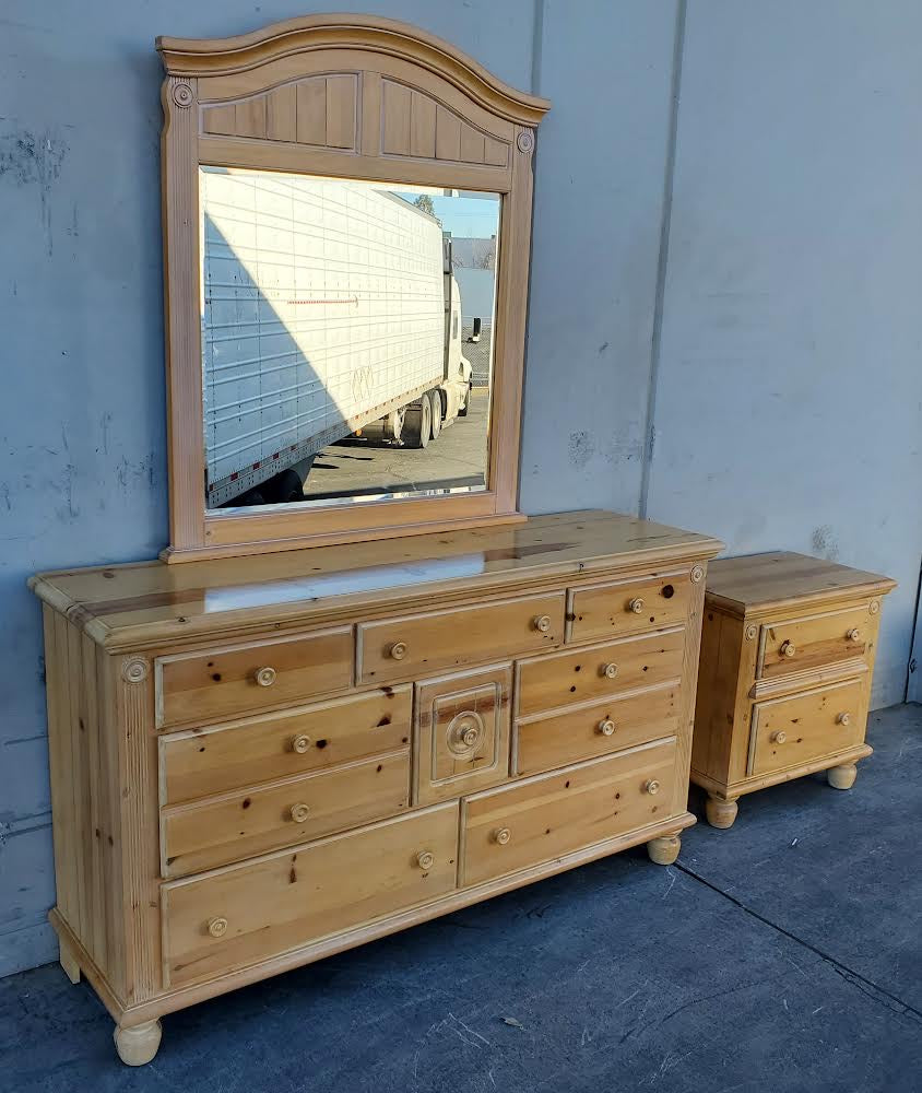 Hello we are selling a light wood/blonde dresser with mirror and nightstand , it is in good condition.