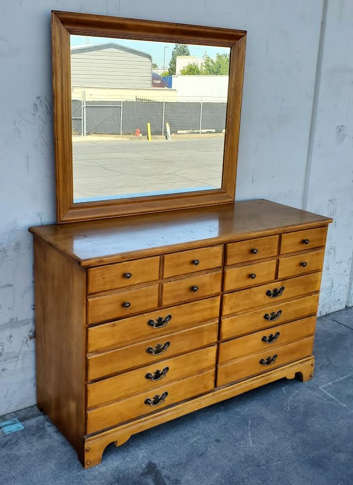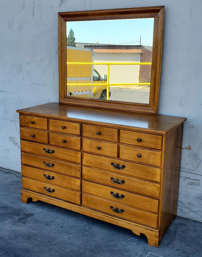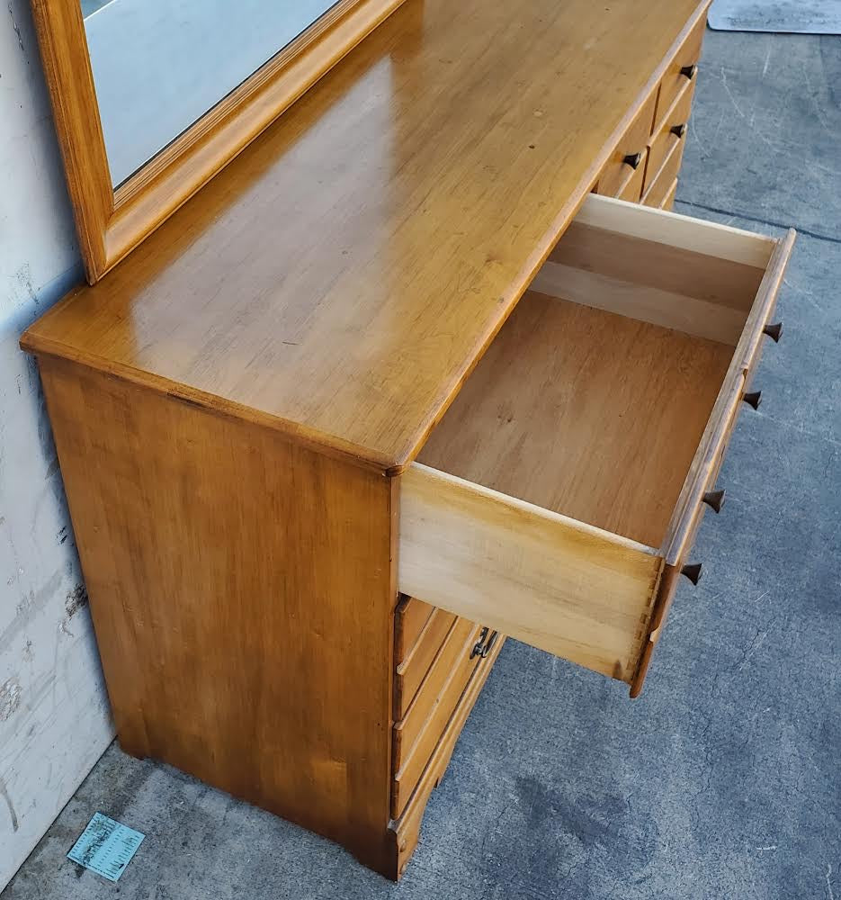 Hello we are selling a light wood dresser with mirror mid century , it is in good condition.