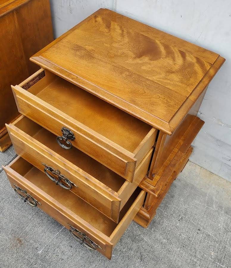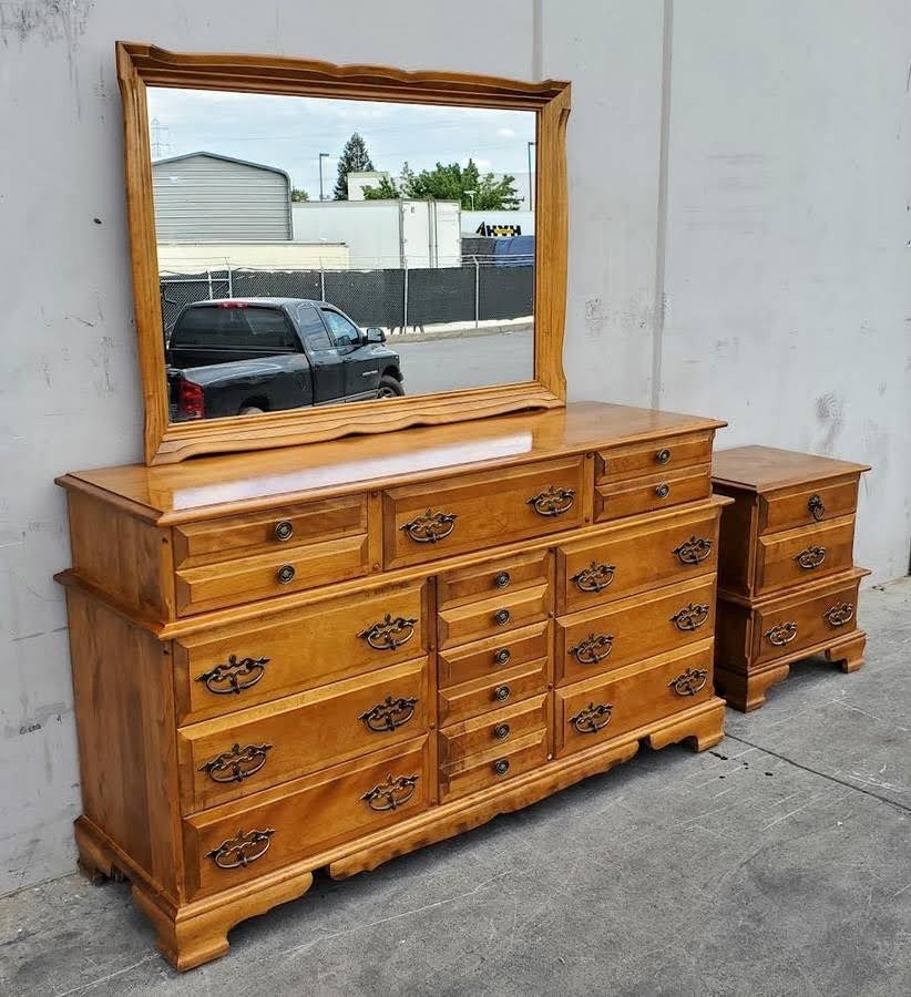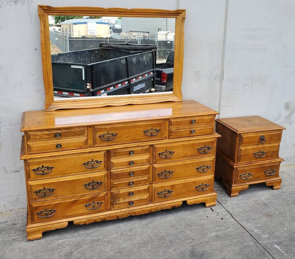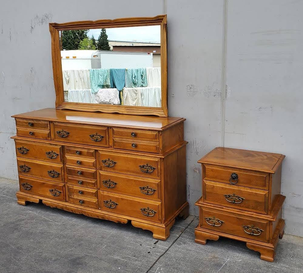Hello we are selling a Meredith dresser with mirror and nightstand/bedside table, it is in good condition.