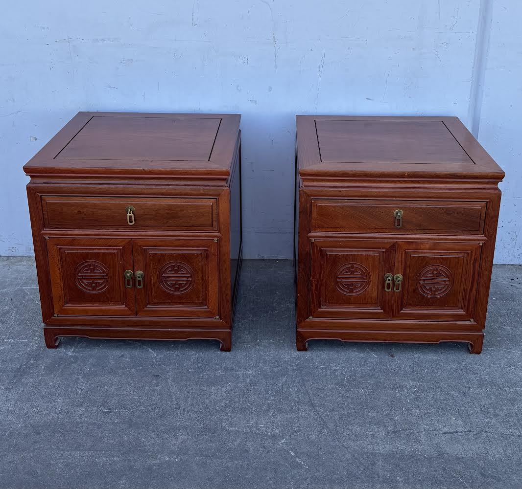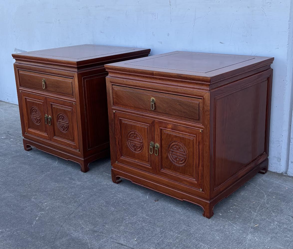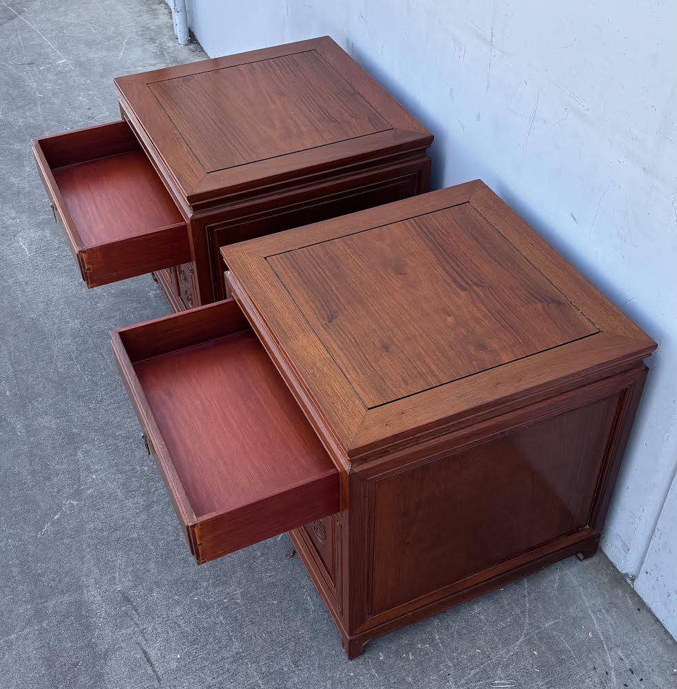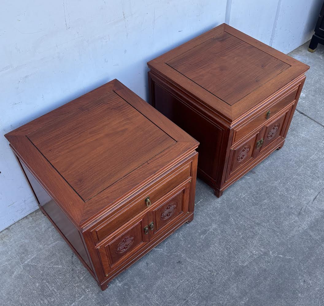 Hello we are selling a Mid 20th Century Pair Asian Rosewood Chinoiserie Nightstands , it is in good condition .