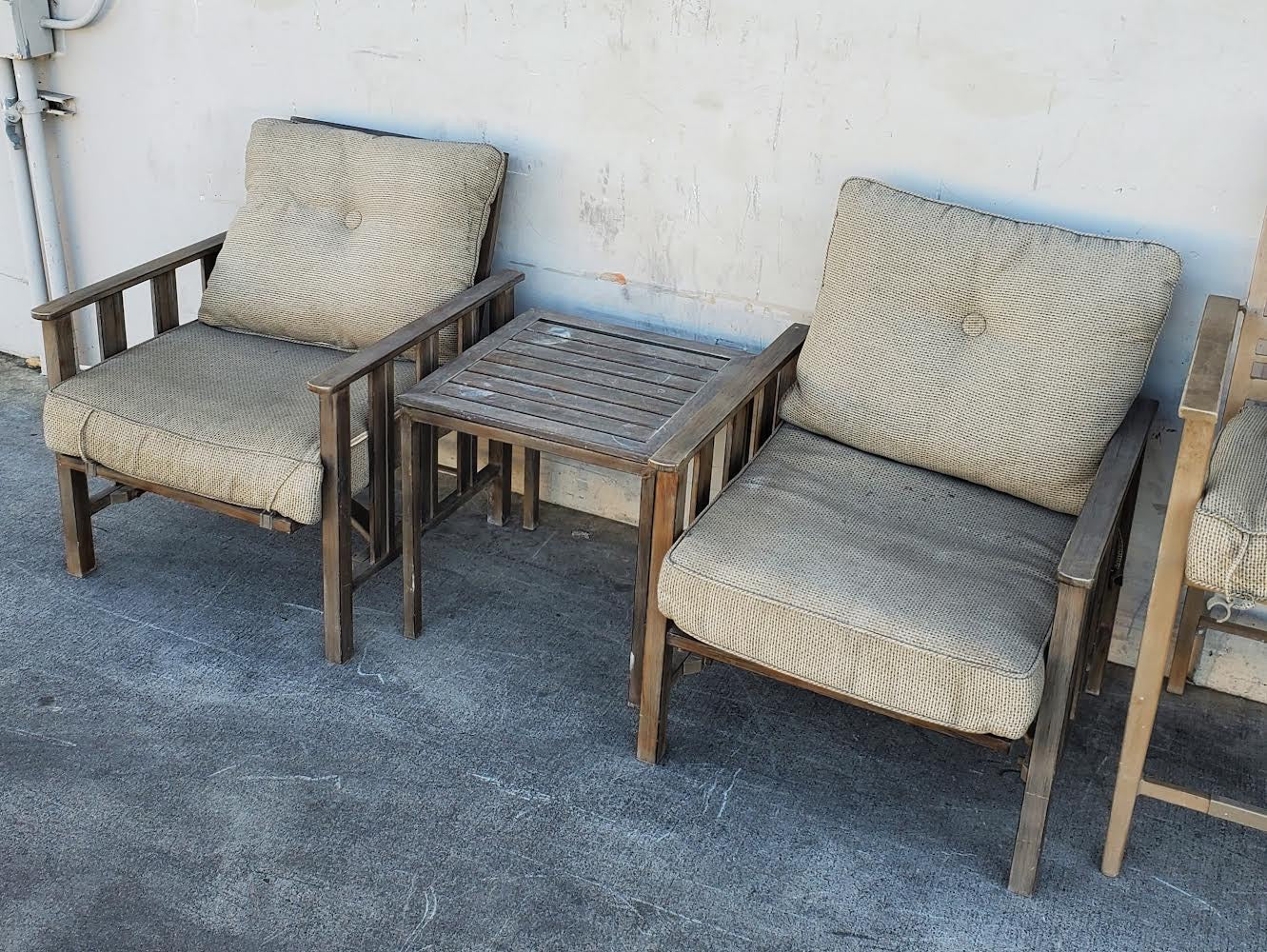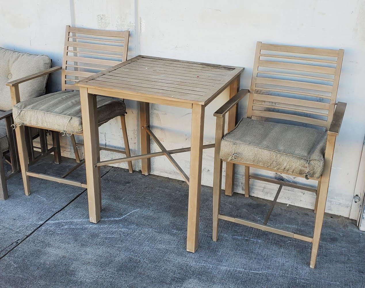 Hello we are selling an orchard patio set wood bistro/bar table with 2 chairs and end/side table with 2 armchairs , it is in good condition.