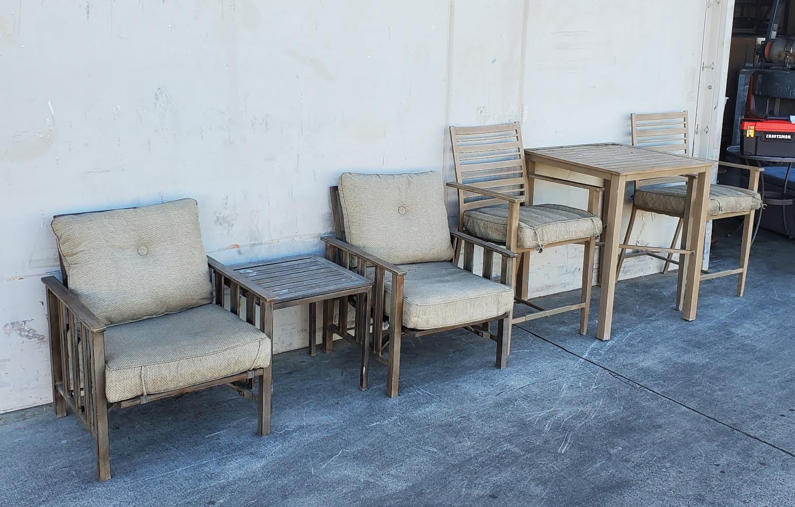 orchard patio set wood bistro/bar table with 2 chairs and end/side table with 2 armchairs