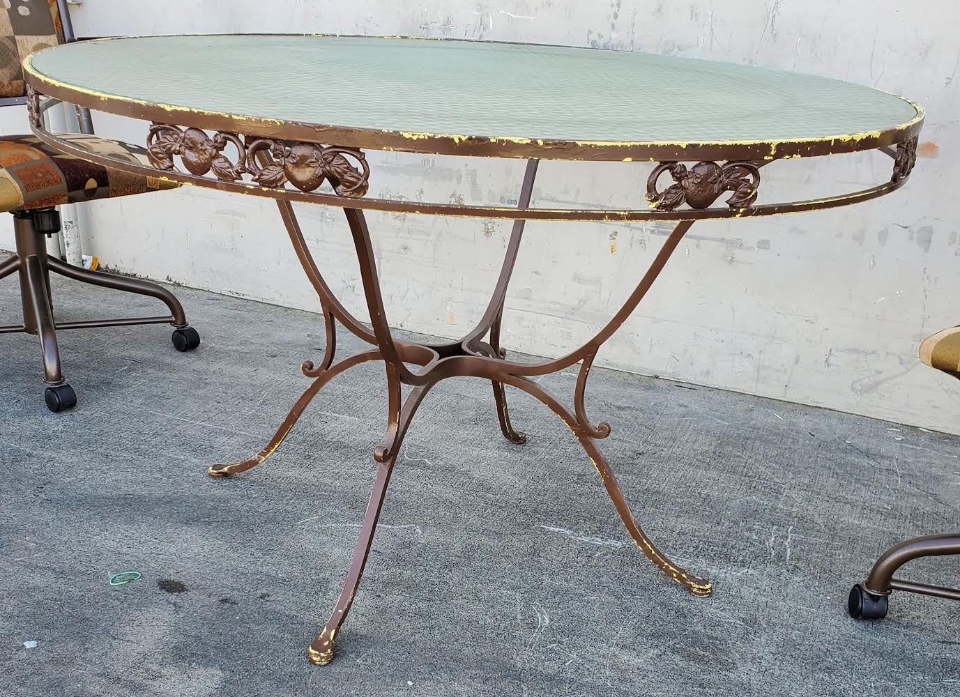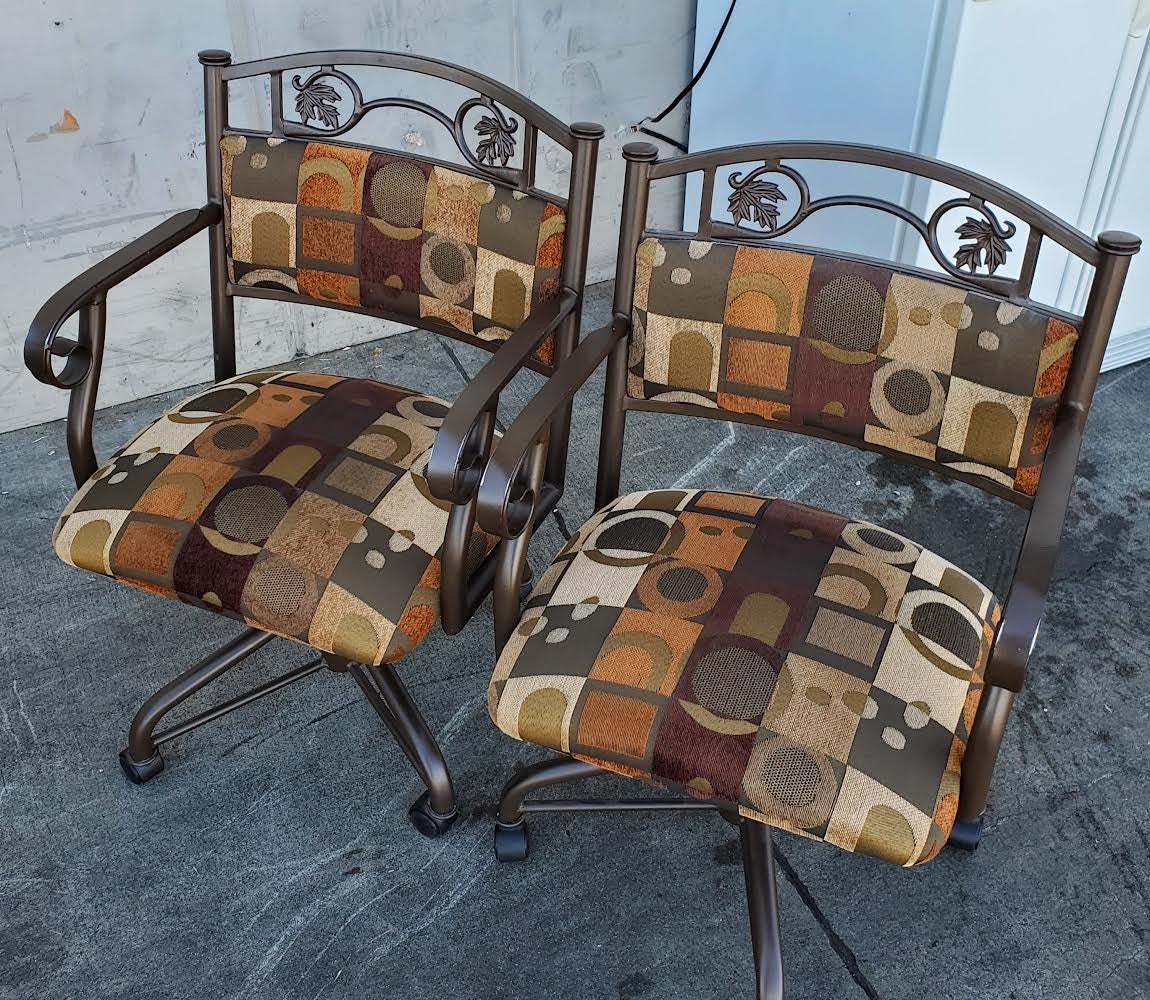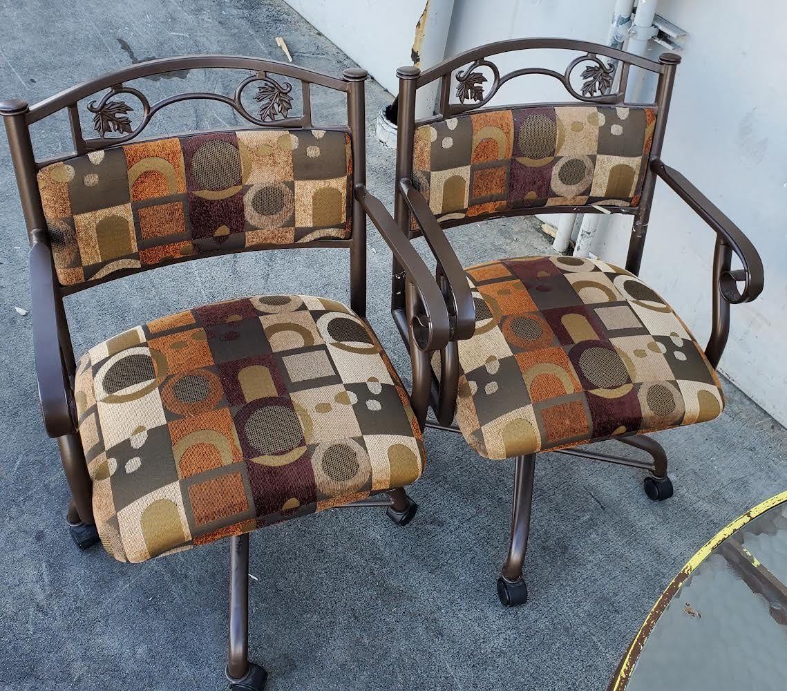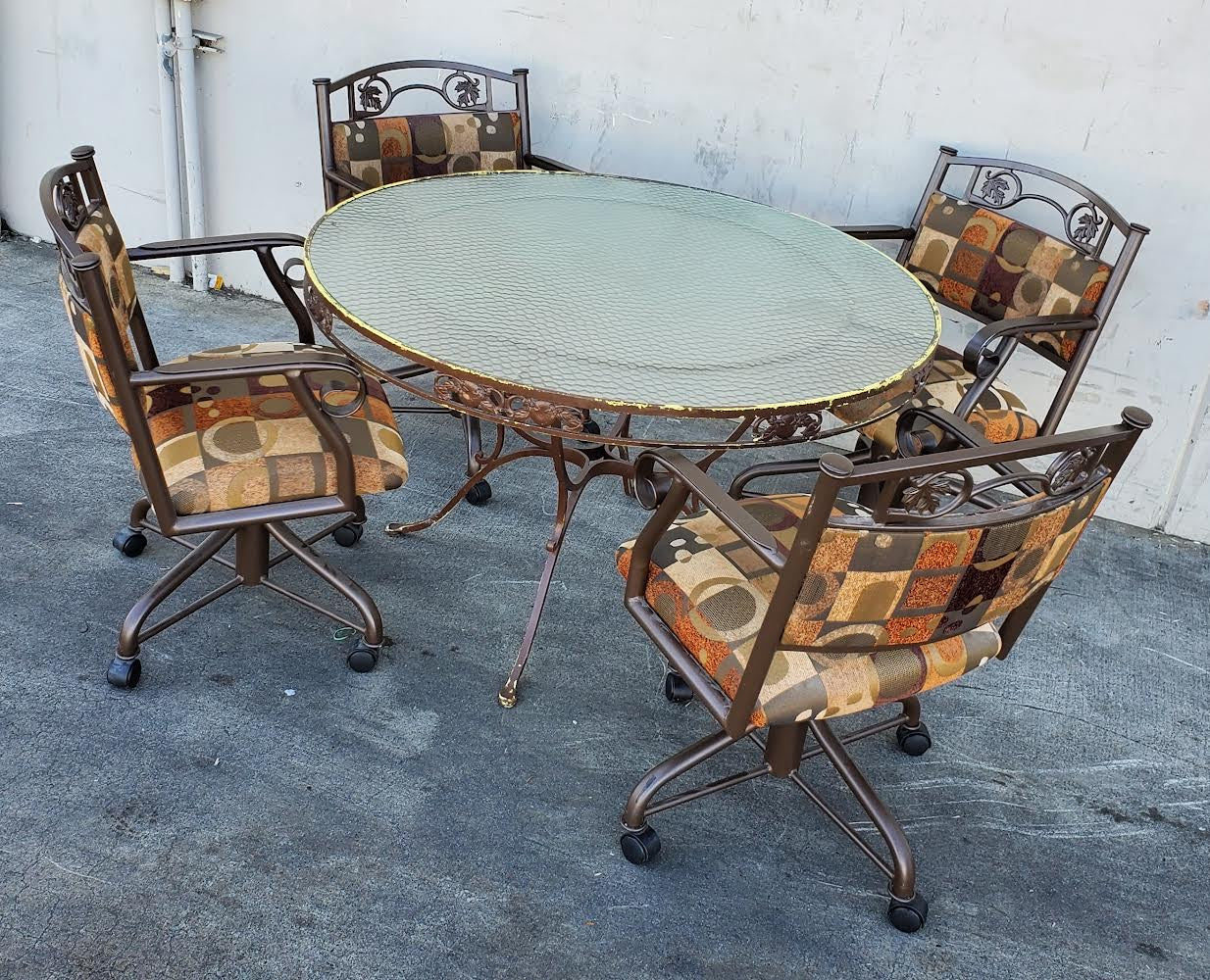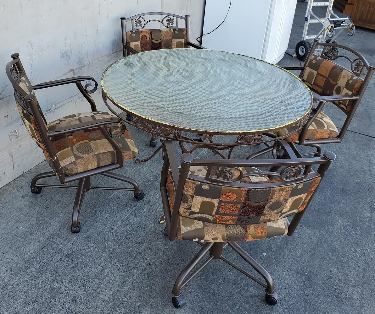 Hello we are selling a patio set round table with 4 chairs on wheels, it is in good condition.
