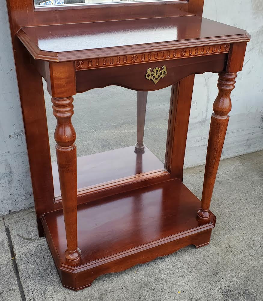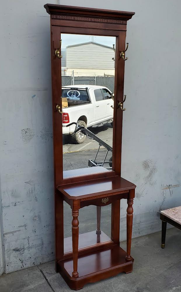 Hello we are selling a Pulaski mahogany vintage solid wood entry/hallway tree with mirror and hat rack , it is in good condition.