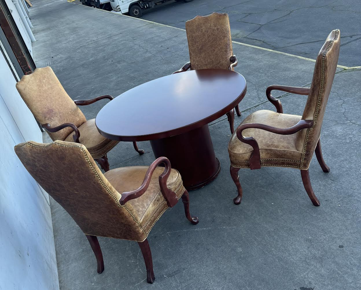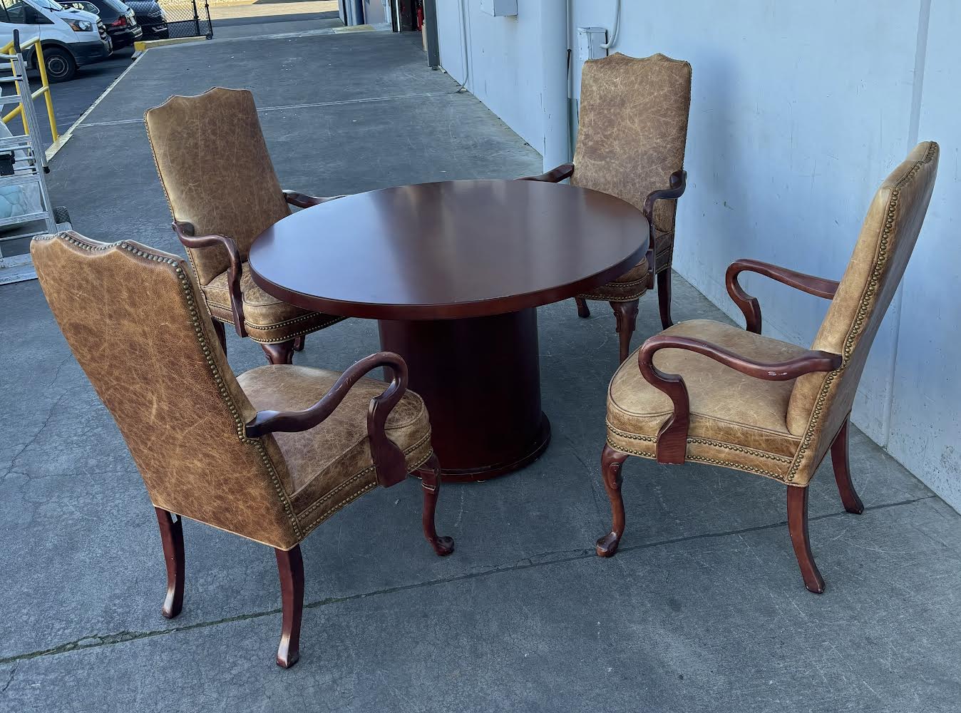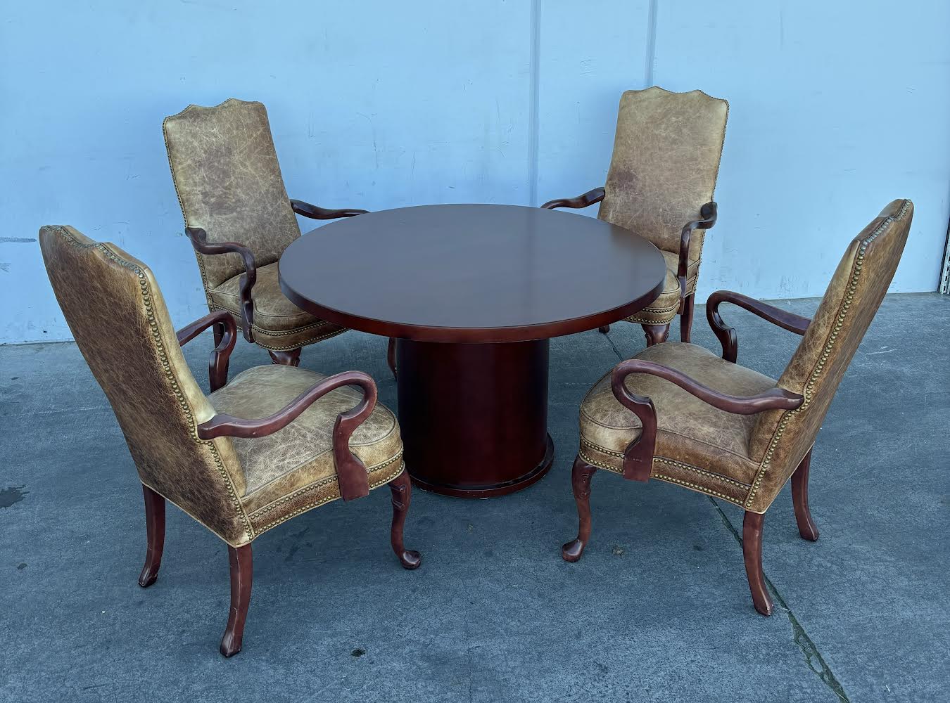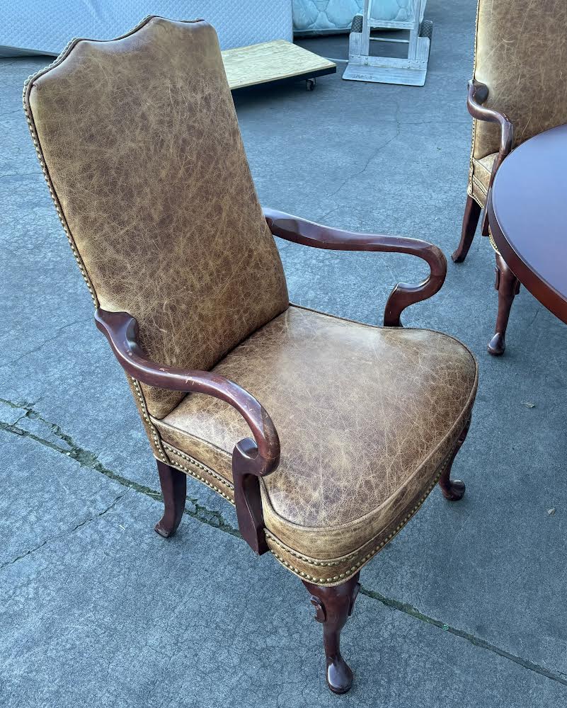 Hello we are selling a Round Cherry Table with 4 Hickory Chairs Brown Leather Queen Anne Style , it is in good condition .