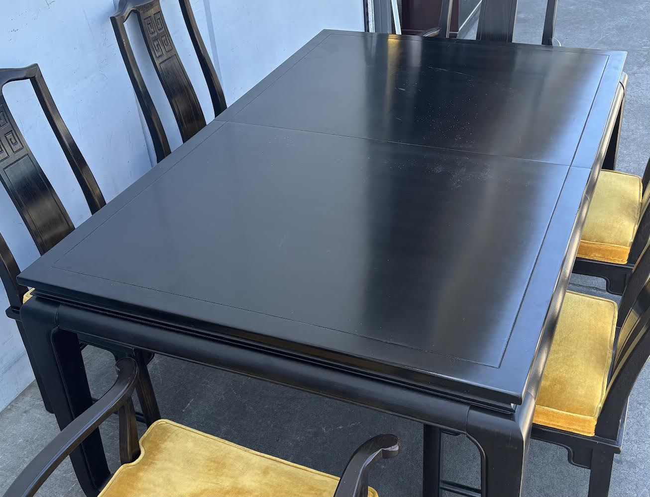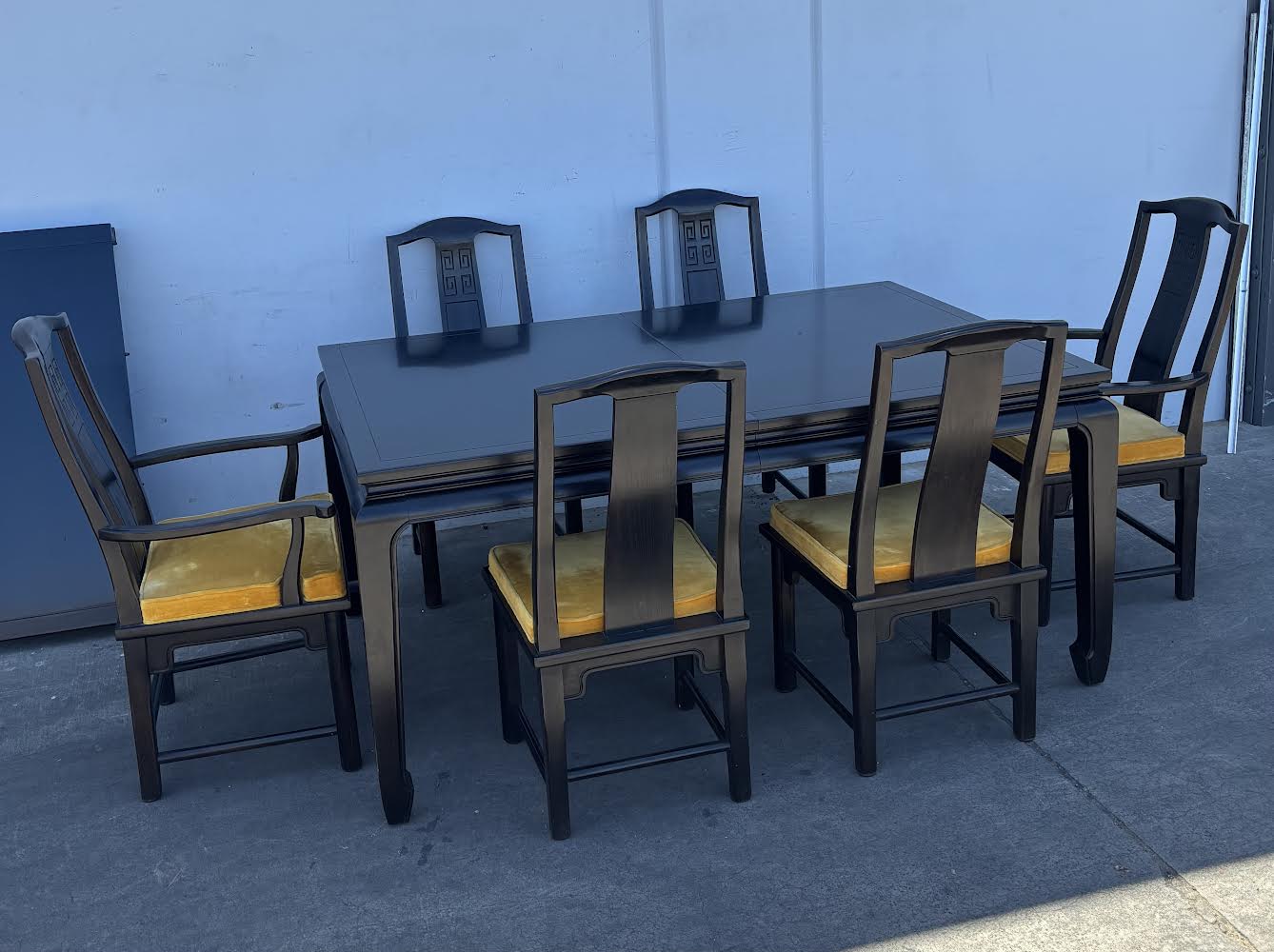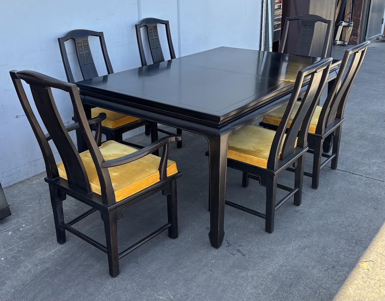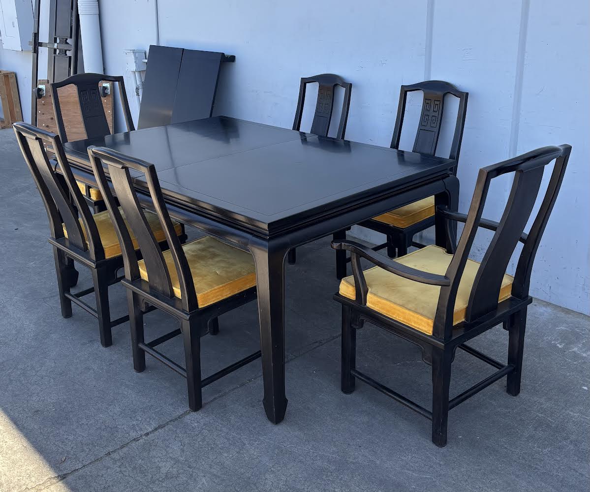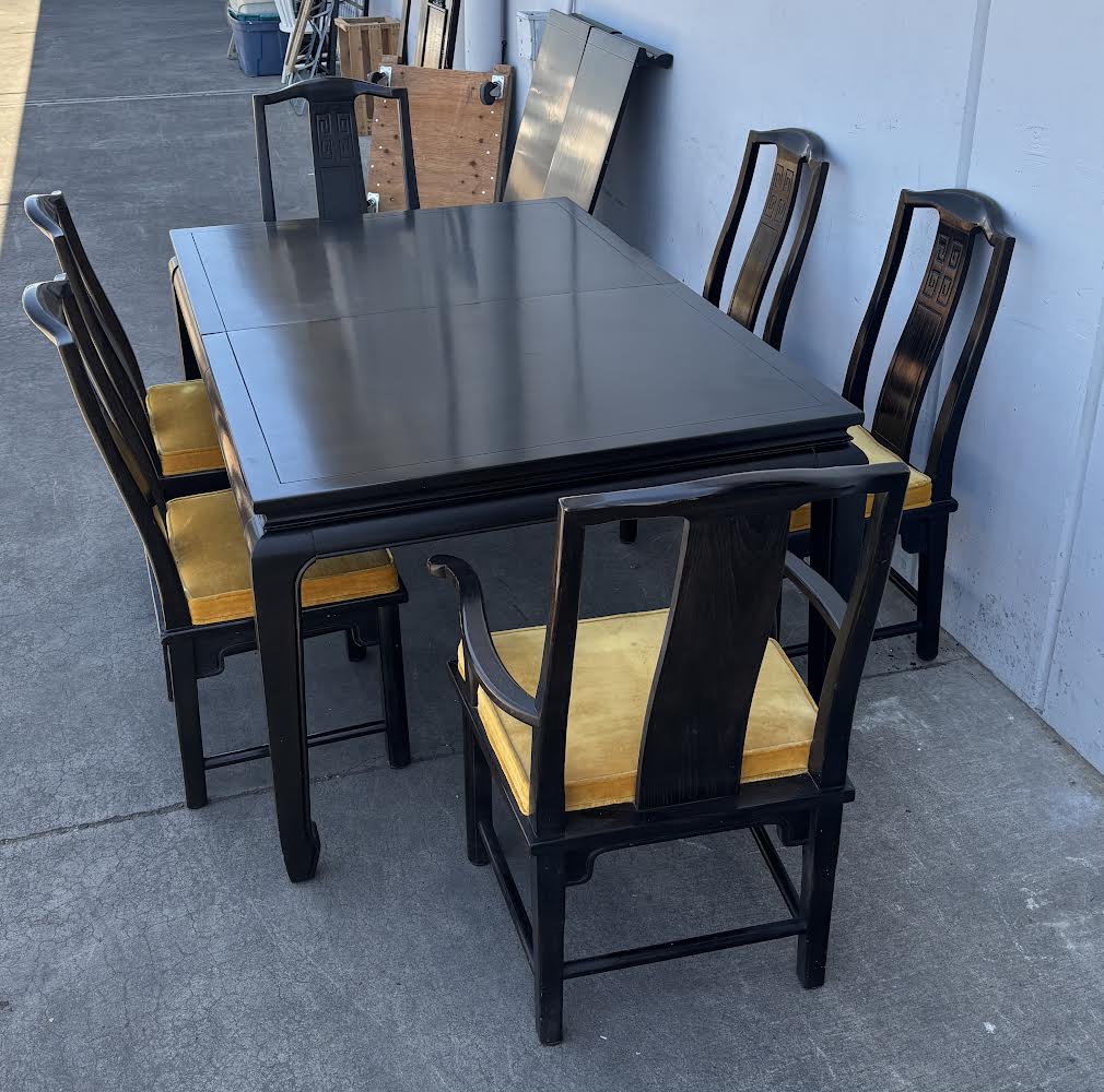 Hello we are selling a Vintage Asian Modern Black Mid Century Style Lacquer Dining Table with 6 Chairs Yellow Cushions , it is in good condition .