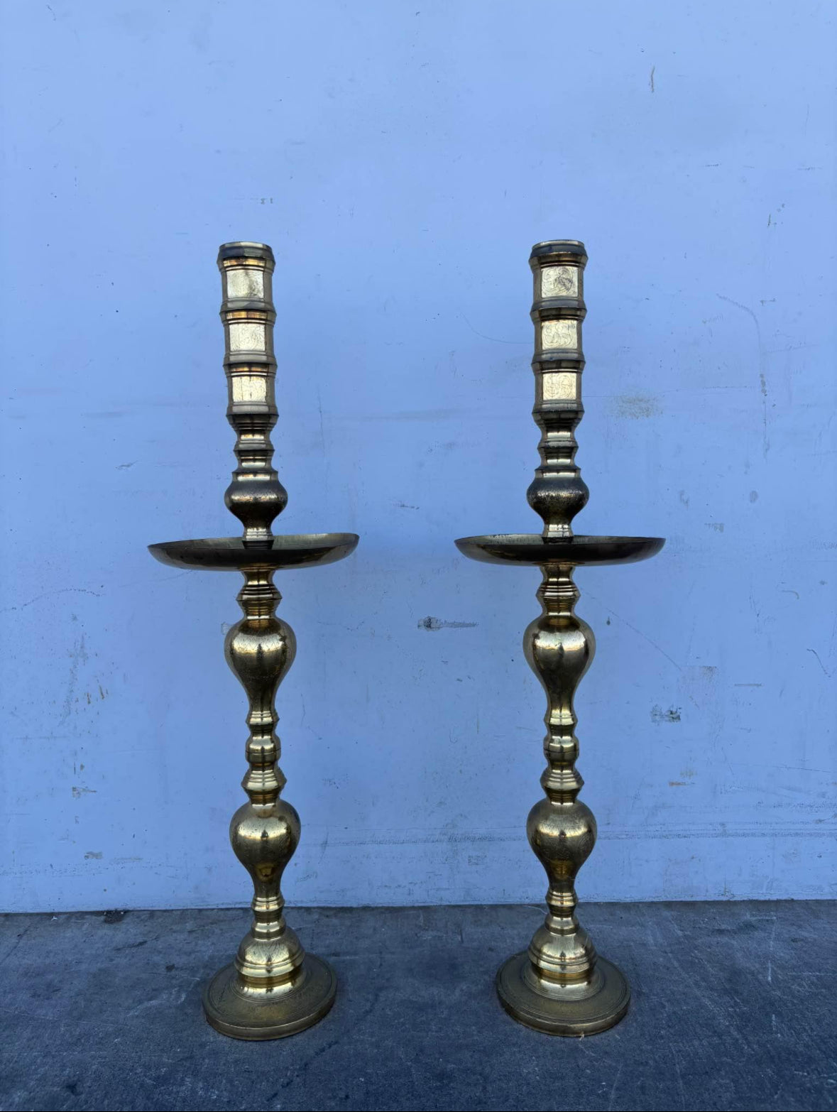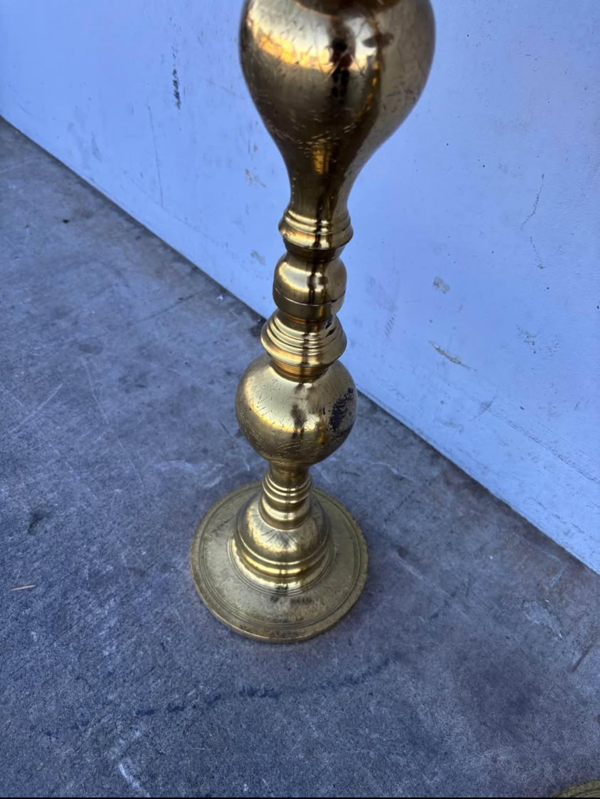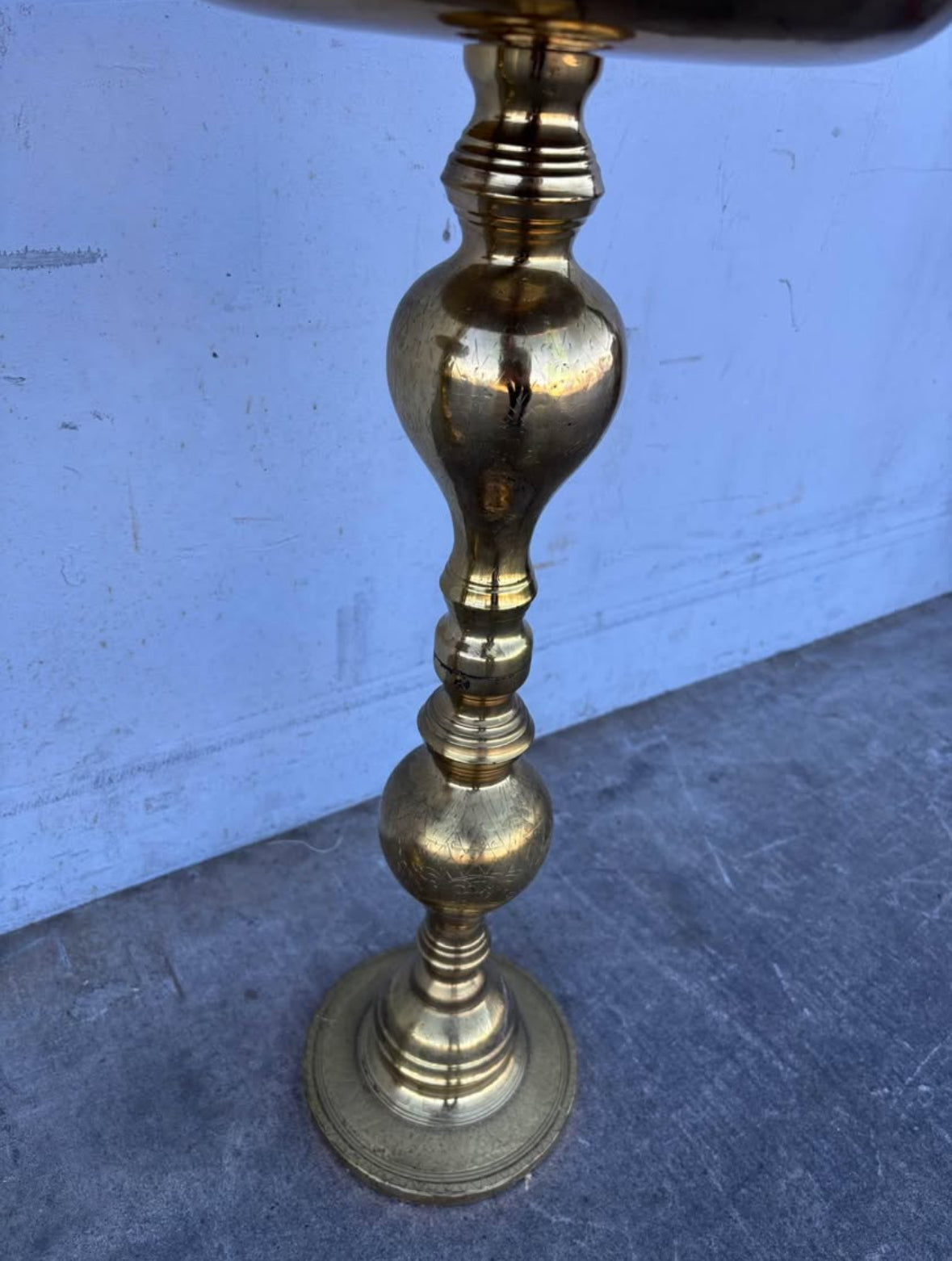 Hello we are selling a Vintage Huge Moroccan Turkish Alter Brass Floor Candle Holder Stand 39 1/2” ,it is in good condition .