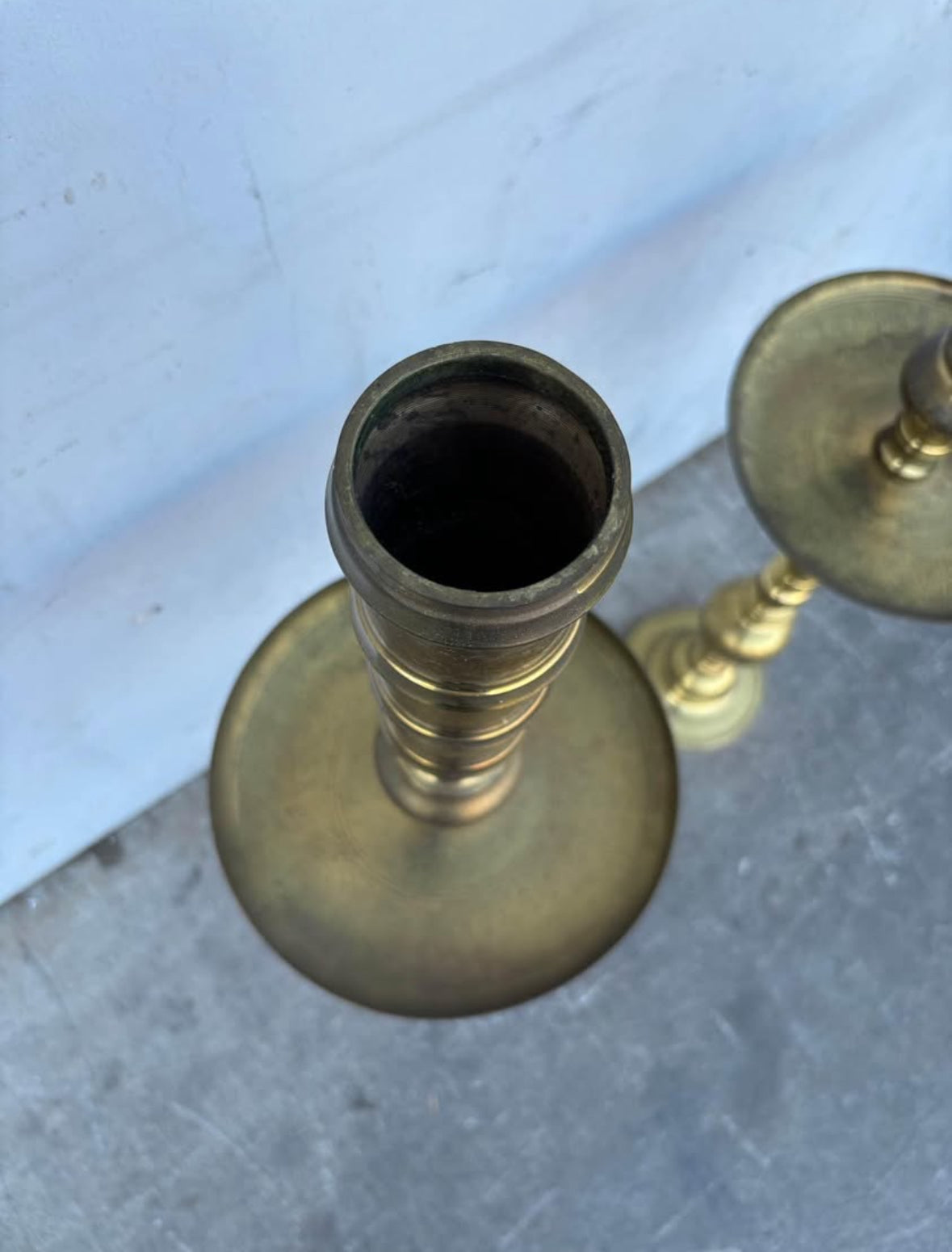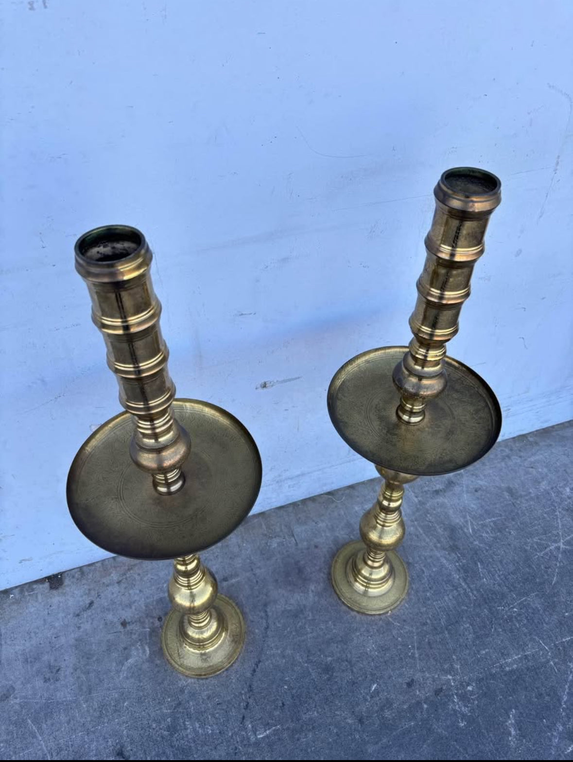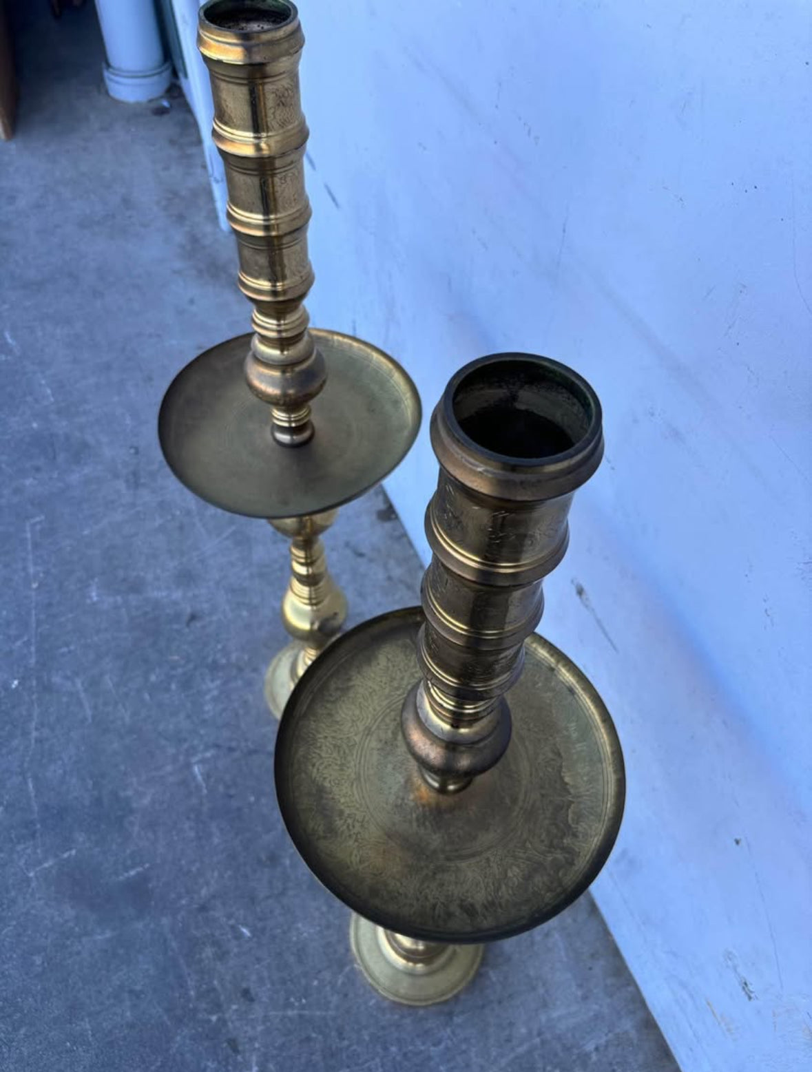 Hello we are selling a Vintage Huge Moroccan Turkish Alter Brass Floor Candle Holder Stand 39 1/2” ,it is in good condition .