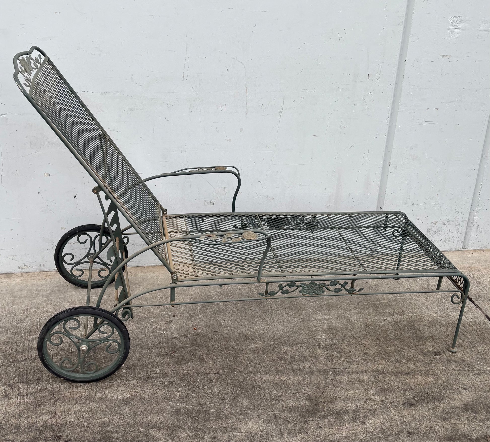 Vintage Wrought iron flower patter garden chaise lounge chair with wheels