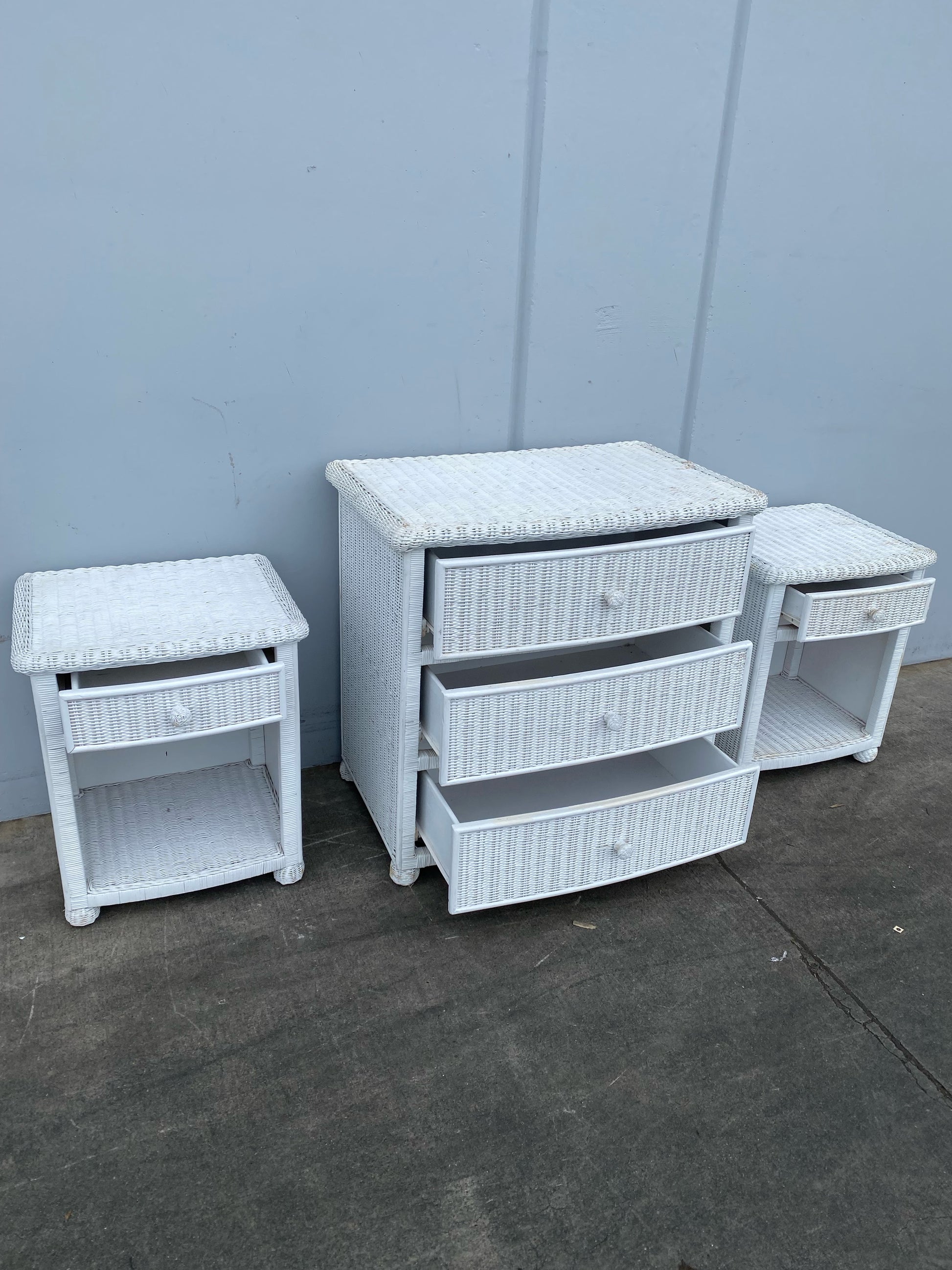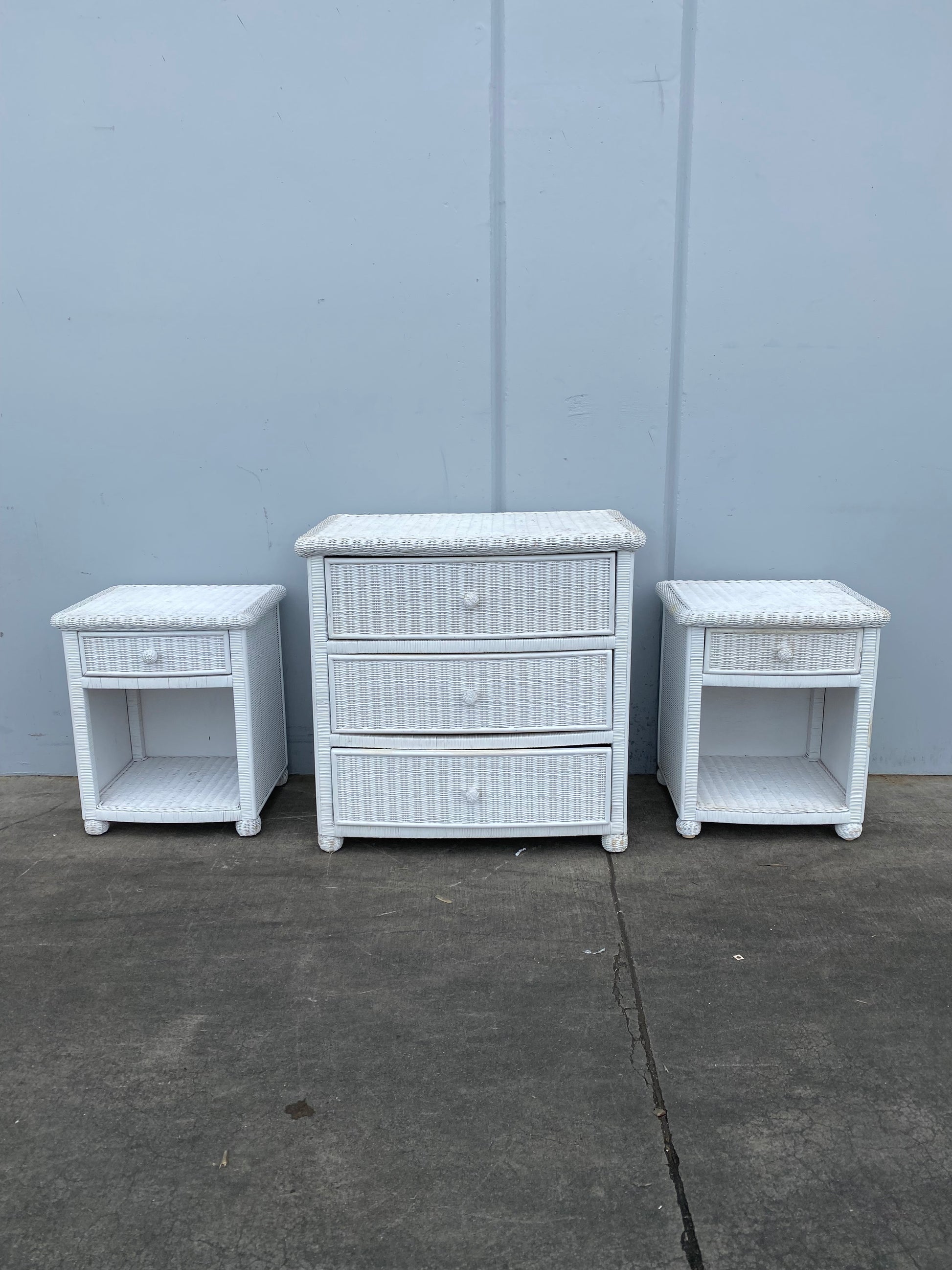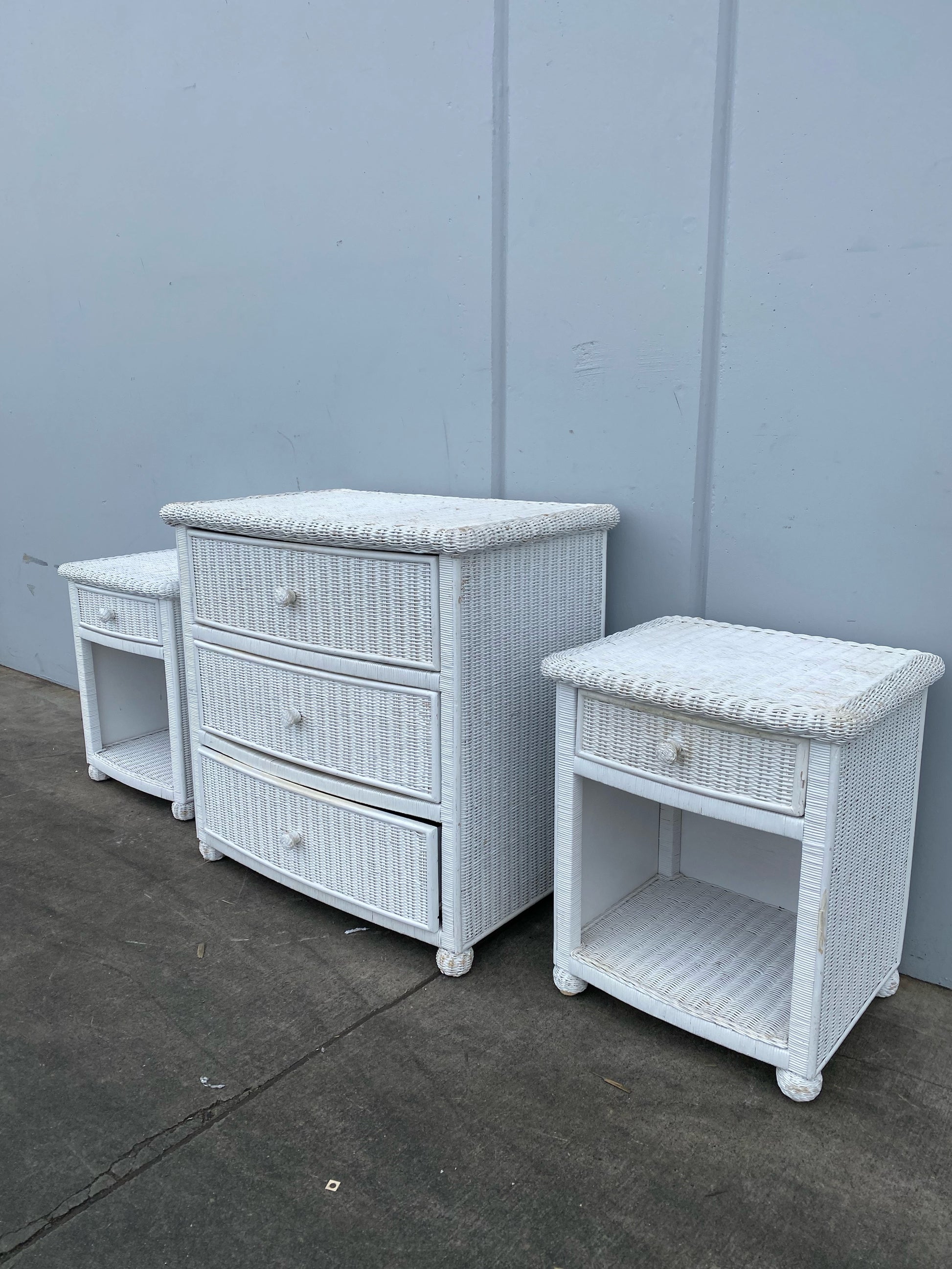 Hello we are selling a white wicker/ cane /rattan dresser with 2 nightstands end/side tables set , it is in good condition.