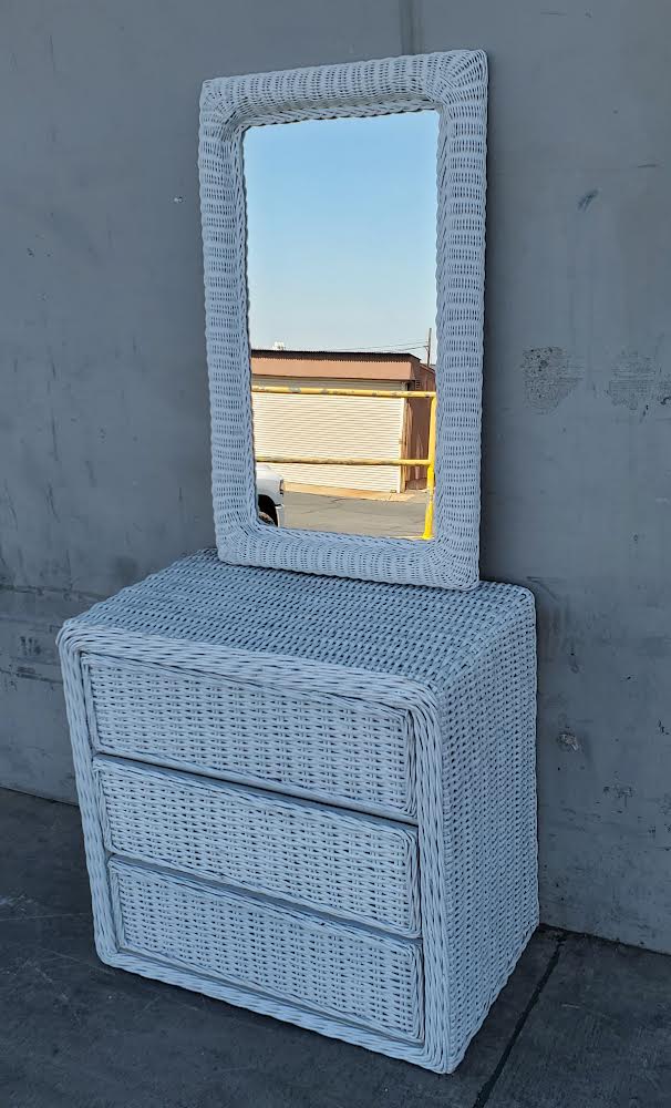 Hello we are selling a white wicker dresser with mirror , it is in good condition.