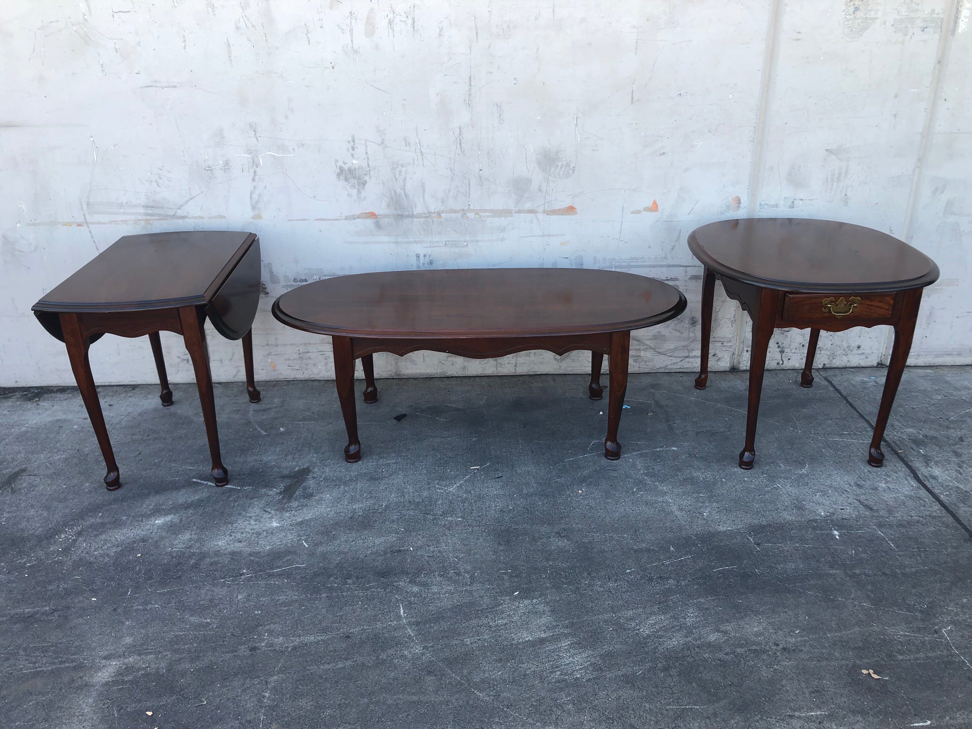 Hello we are selling a dark wood 3 piece living room set coffee table, 2 end/side tables (1 w/drawer, 1 w/drop leaf) , it is in good condition.