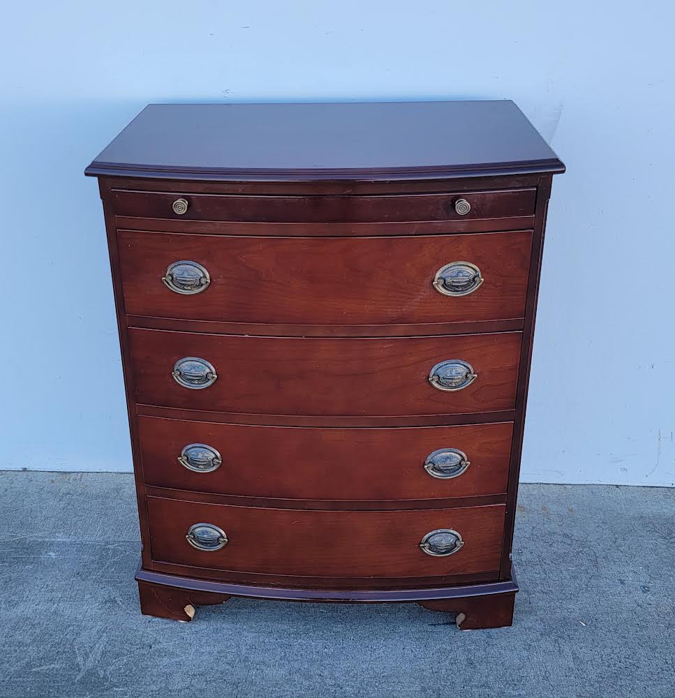 Hello we are selling a Dark wood mahogany Bombay style dresser/ chest of drawers/ nightstand with slide-out tray , it is in good condition.